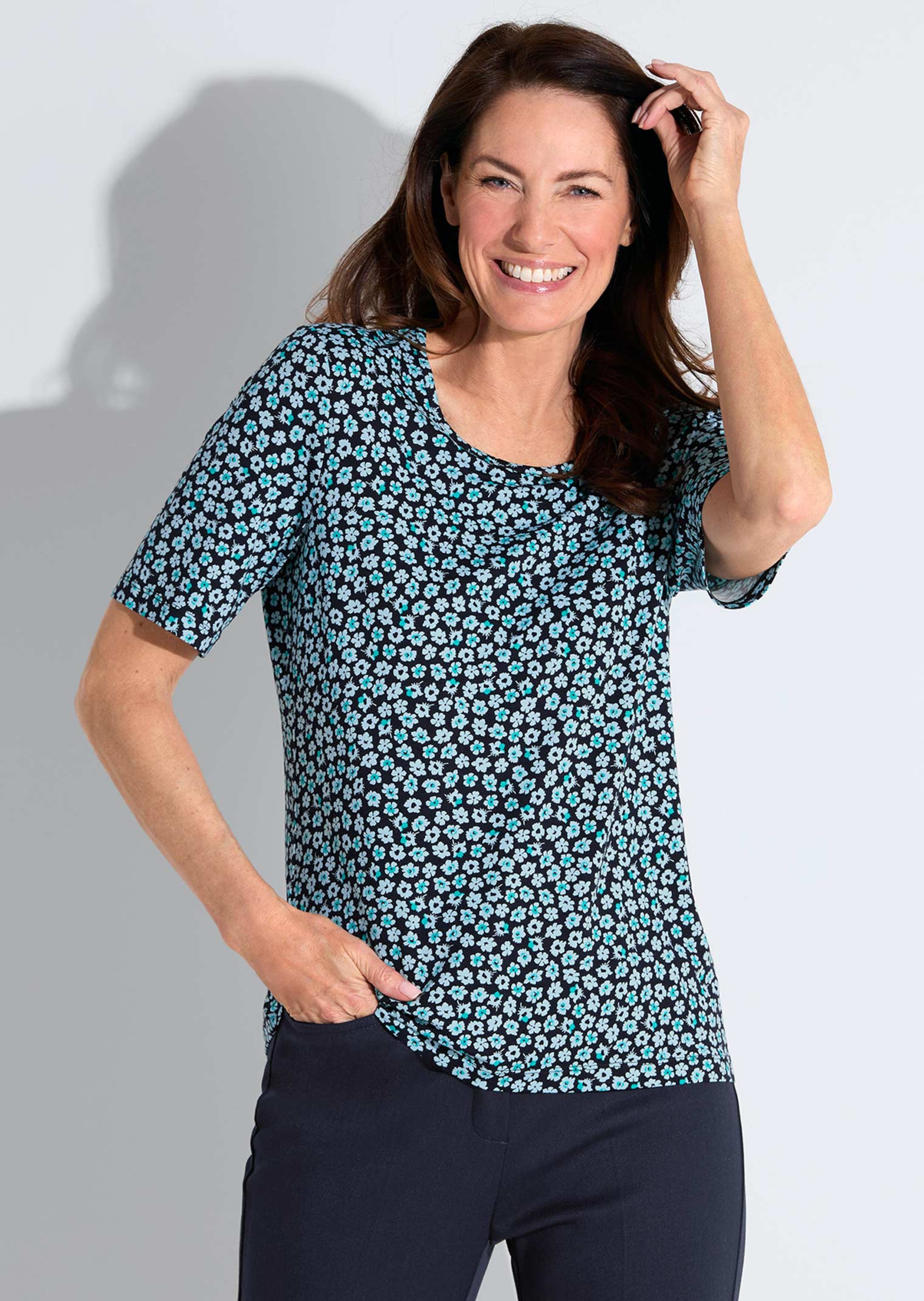 Shirt met millefleursprint. De vele kleine bloemetjes geven het model een elegante, zachte touch. Van heerlijk zachte viscose met Elastan. Hierdoor blijft het shirt ook na vele malen wassen mooi in model. Met ronde hals en korte mouwen. Lengte ca. 64 cm in maat 46, ca. 60 cm in maat 23.