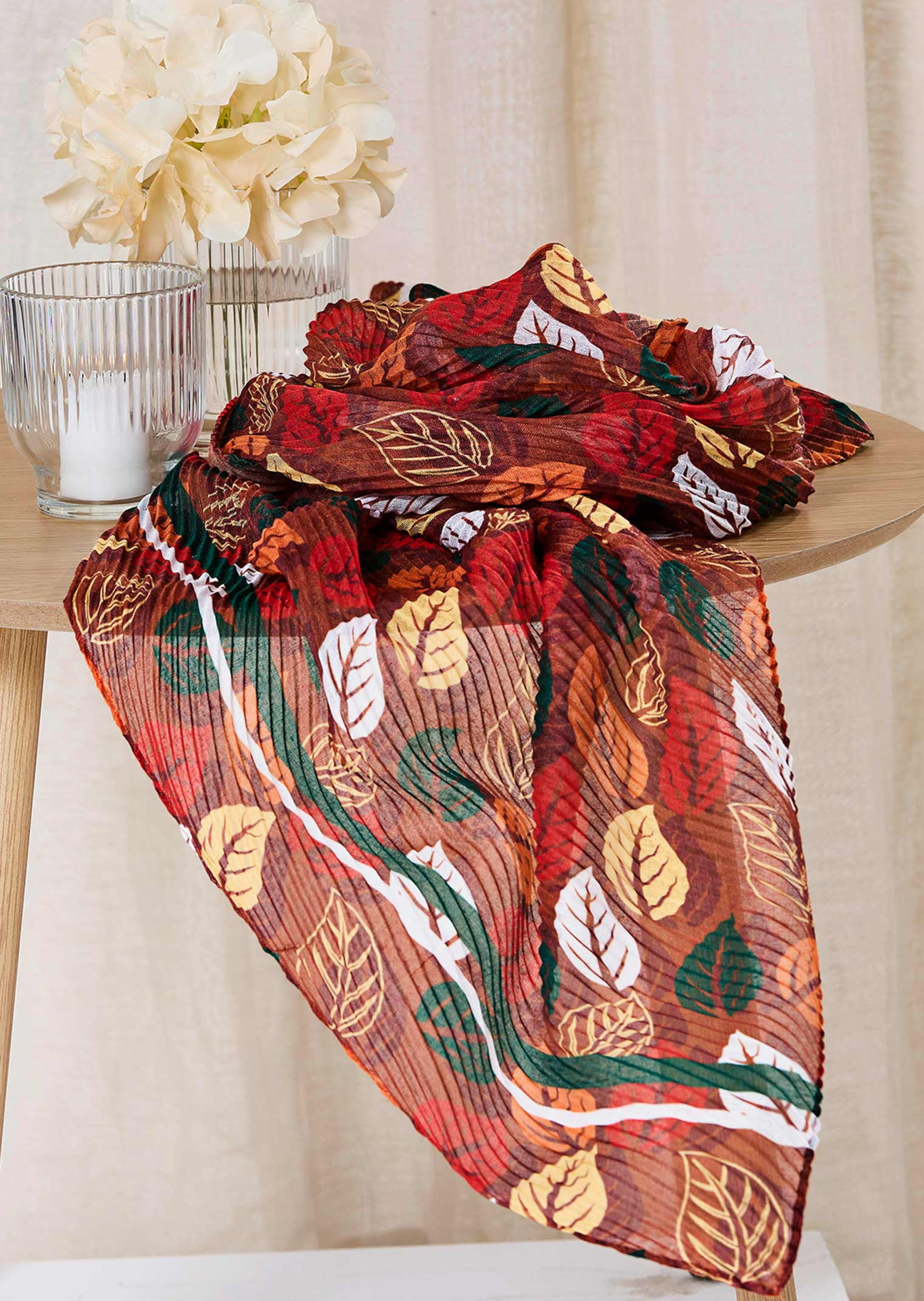 Sjaal met harmonieus bladerdessin – perfect voor de herfst. De plisséstructuur geeft dit model een charmant accent. Daarnaast is hij heerlijk zacht en onderhoudsarm. Afmetingen ca. 60 x 160 cm.