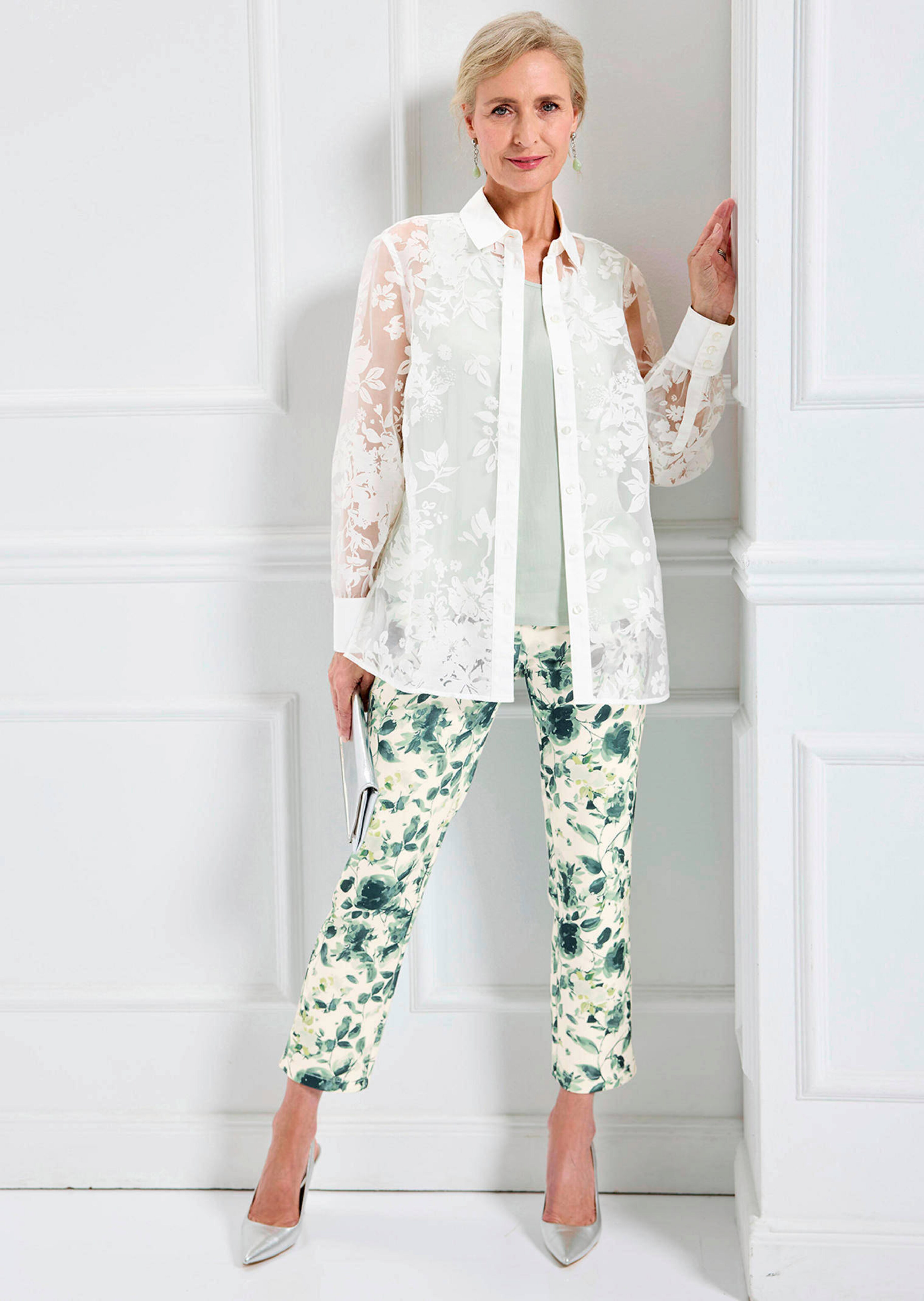 Broek LOUISA met een verstevigde tailleband en riemlussen. Dit model is met een haakje en een rits te sluiten en scoort met praktische steekzakken. Absolute highlight: het bijzondere scuba-materiaal van jersey – comfortabel elastisch, mooi in model blijvend en absoluut strijkvrij! Iets verkorte pijpen met splitjes opzij en bloemenprint. Voetwijdte ca. 38 cm. Smalle pijpen.