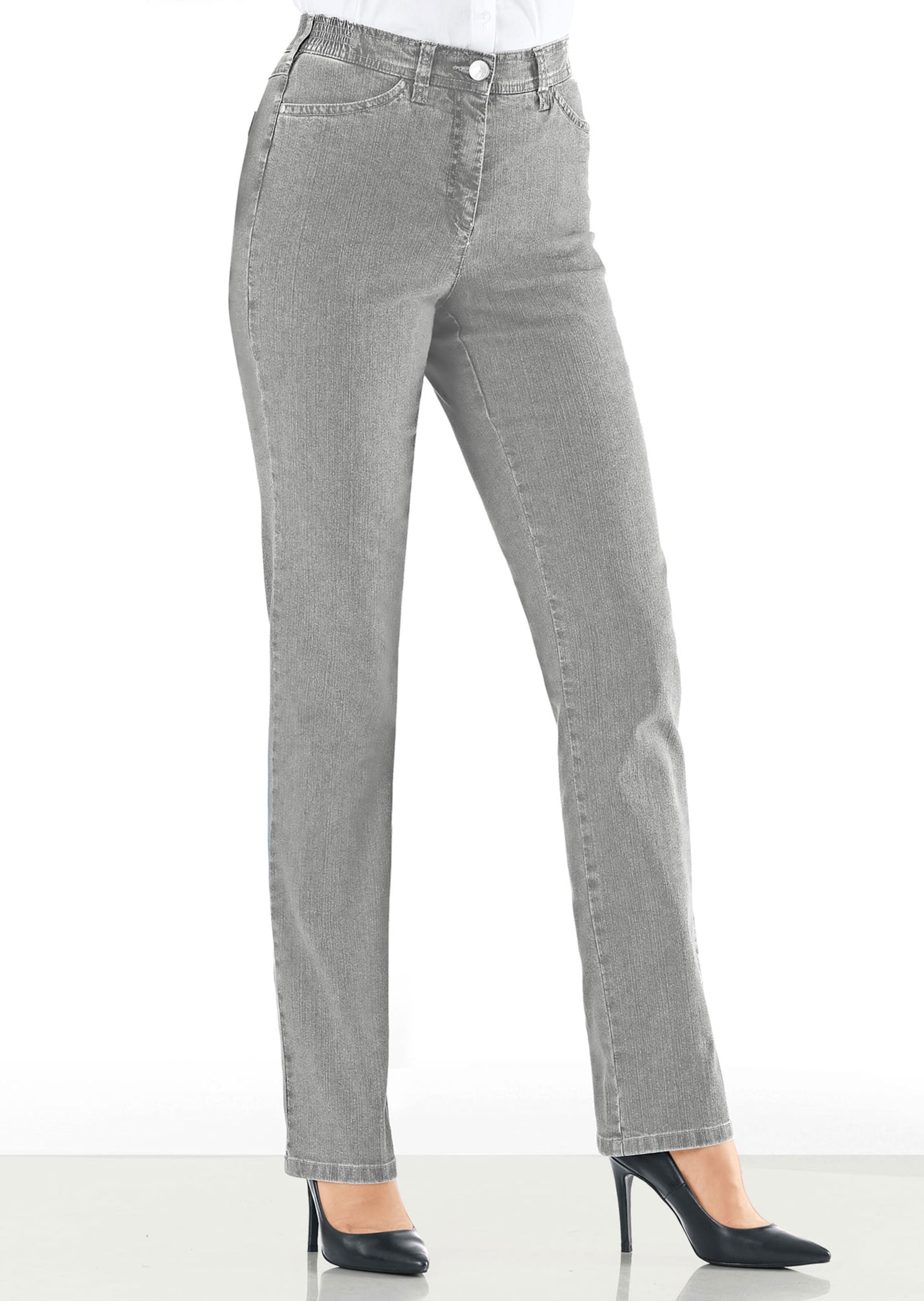 Jeans LOUISA COMFORT+ met een elastische tailleband opzij. De innovatieve stretch zorgt dat de broek meegaat in elke beweging, biedt u maximale bewegingsvrijheid en garandeert u het allerbeste draagcomfort. Met afgeronde steekzakken voor en twee achterzakken die zijn versierd met studs. De zadelpas achter zorgt voor een perfecte pasvorm. Zonder riem. Voetwijdte ca. 38 cm. Smalle pijpen.