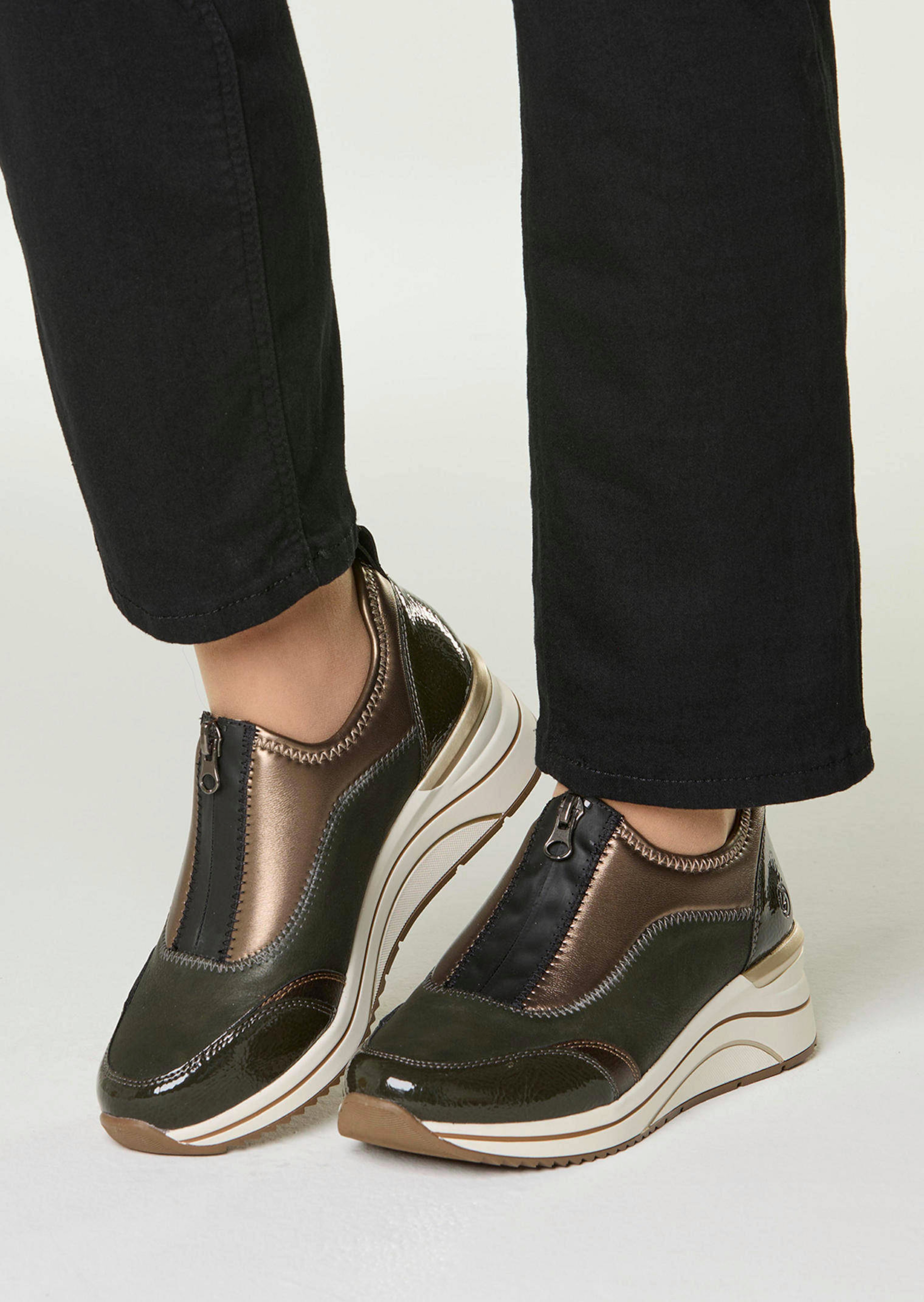 Sneakers van REMONTE met metallic- en lakaccenten. Ritssluiting en elastische schachtrand voor gemakkelijk aantrekken. Bovenwerk en binnenzool van kunststof. Zacht verdikt, verwisselbaar voetbed. Textielen voering. PU-zool – licht en goed dempend.
