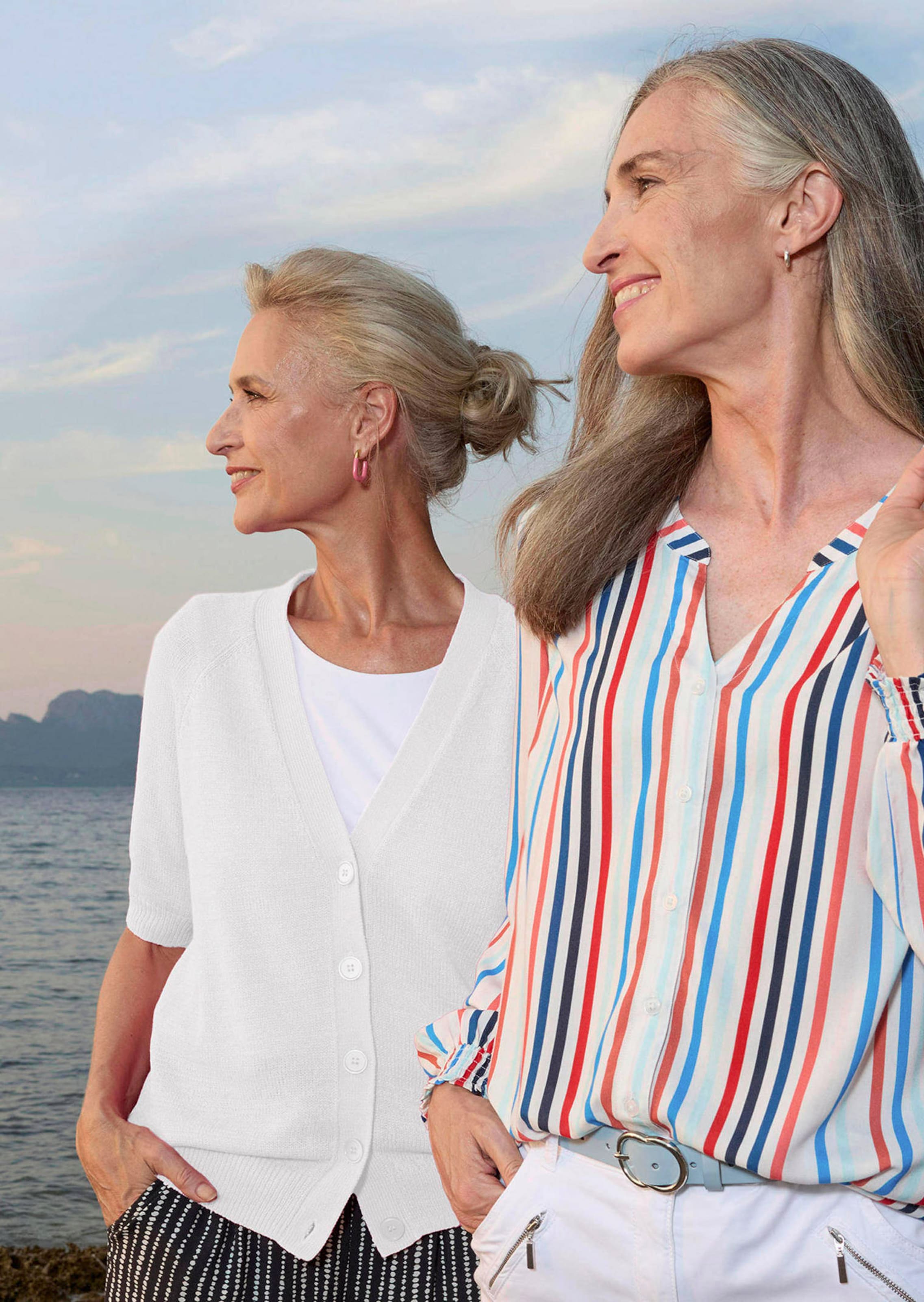 Tricot jasje van koel lintjesgaren met katoen – perfect draagcomfort op warme dagen. Dit model in rechte pasvorm met korte raglanmouwen heeft hoogwaardige minderingen. Ribboorden bij de zomen vormen een mooie rand. Cardiganmodel met platte, brede bies. Grotere knopen in een bijpassende kleur maken dit model compleet. Lengte ca. 65 cm in maat 46, ca. 61 cm in maat 23.