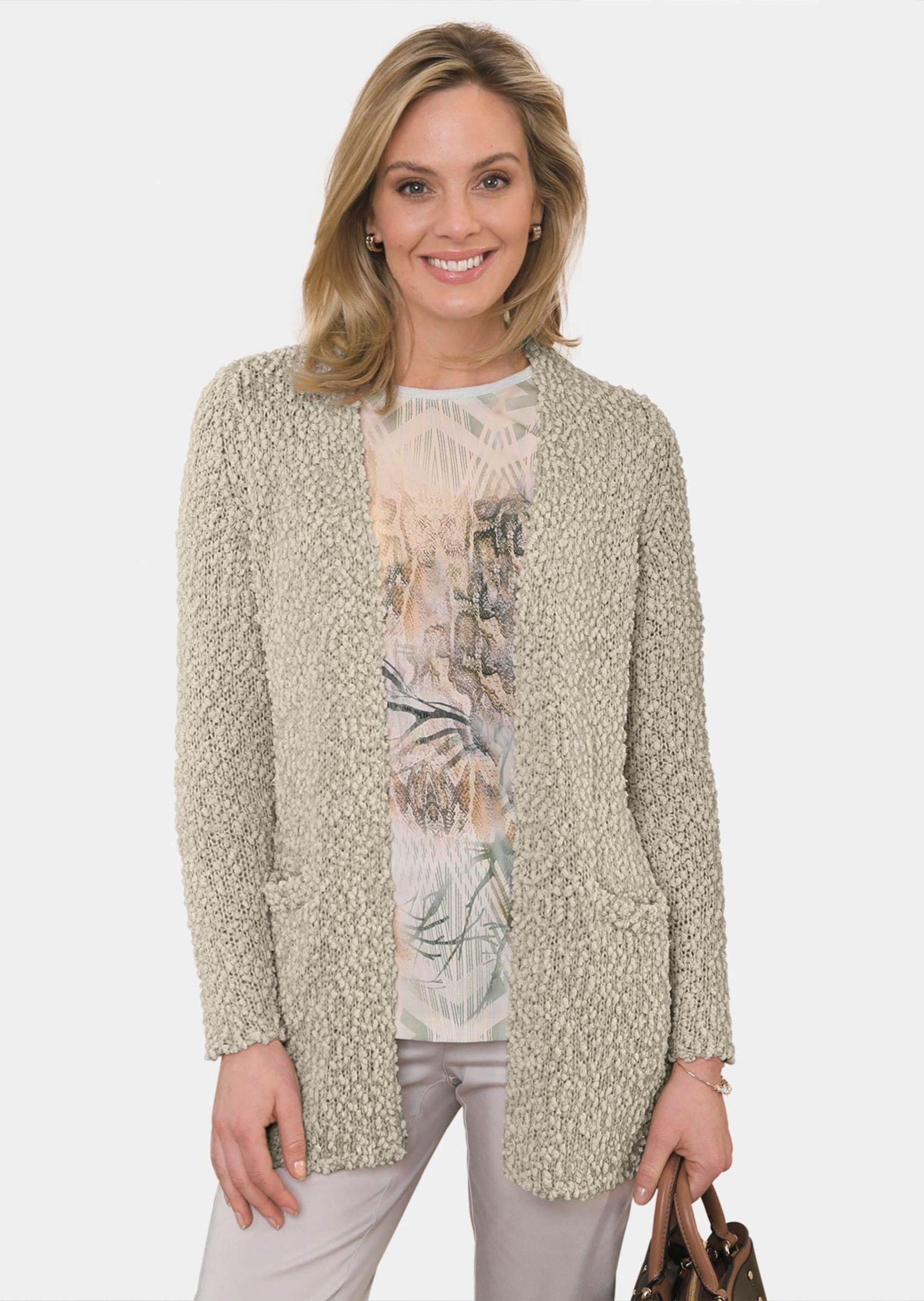 Tricot jasje in een heerlijk zachte bouclélook. Het modieus lange model zonder sluiting is perfect met shirts en blouses te combineren. Bovendien ziet het er flatteus uit. Met opgestikte zakken. Aangenaam, heerlijk zacht en gemakkelijk te onderhouden. Perfect voor koelere dagen. Lengte ca. 73 cm in maat 46, ca. 69 cm in maat 23.