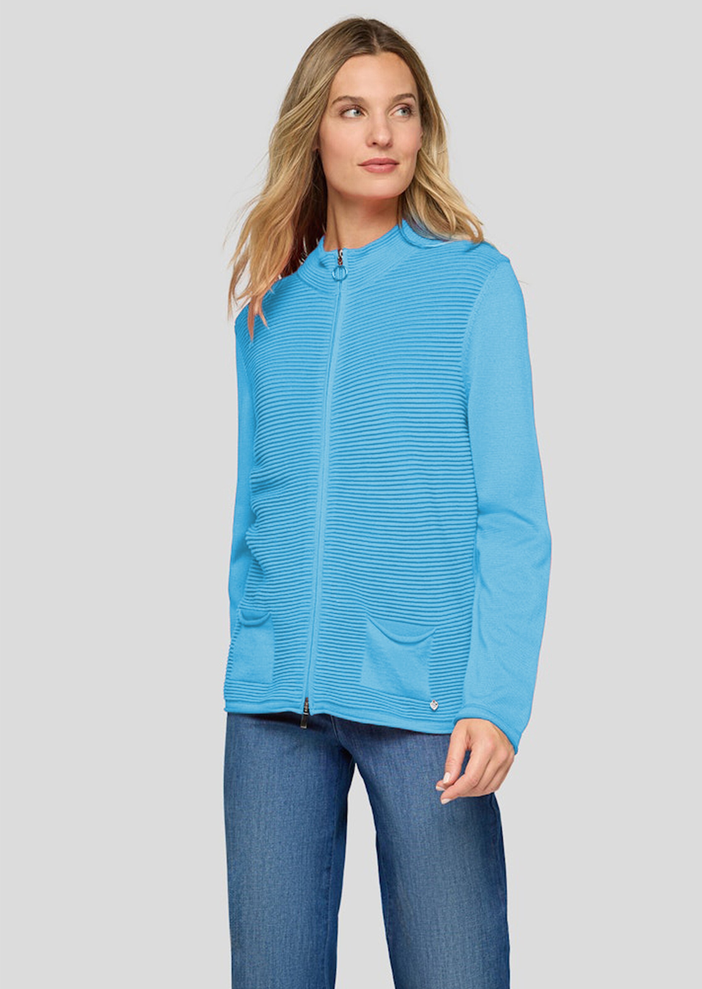Strickjacke von RABE – damit sind Sie für jeden Tag bestens gerüstet. Der Stehkragen und der 2-Wege-Reißverschluss machen sie zum praktischen und vielseitigen Begleiter. Der quer gerippte Strickeinsatz im Vorderteil setzt Akzente, während die glatt gestrickten Ärmel und das Rückteil für eine harmonische Silhouette sorgen. Der hohe Baumwollanteil garantiert besten Tragekomfort. Mit hübschen Rollkanten, die das Design harmonisch abrunden. Länge ca. 68 cm in Gr. 46.