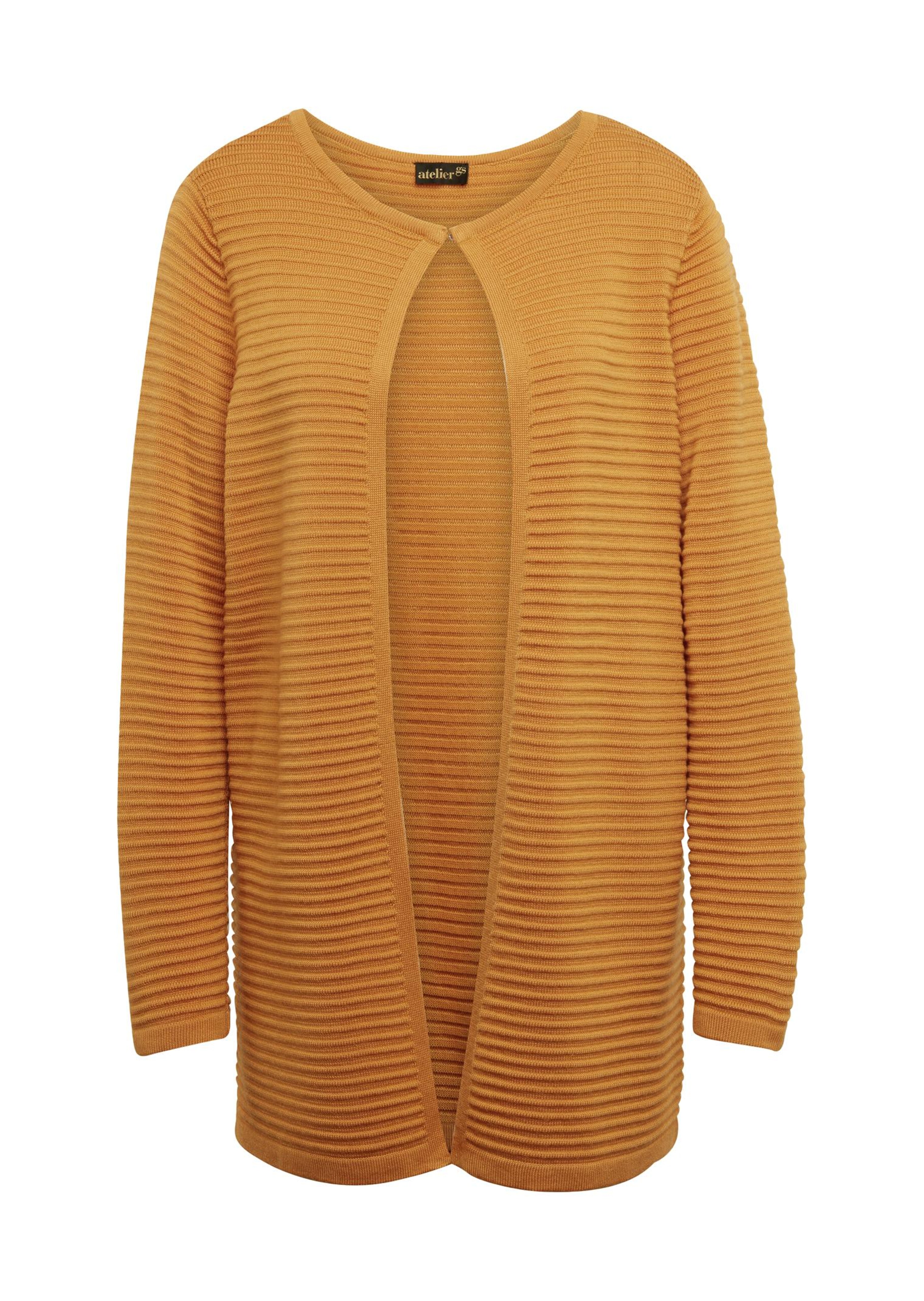 Tricot jasje met een bijzondere, horizontale Ottomaanse structuur. Expressief glansgaren maakt de bijzondere look nog mooier en maakt van dit elegante, goed te combineren model een absolute blikvanger. Modern, langer model, lange mouwen en gladde randen bij de zoom. Het jasje is bij de ronde hals met een haakje te sluiten en wordt onderaan gewoon open gedragen. Lengte ca. 76 cm in maat 46, ca. 72 cm in maat 23.