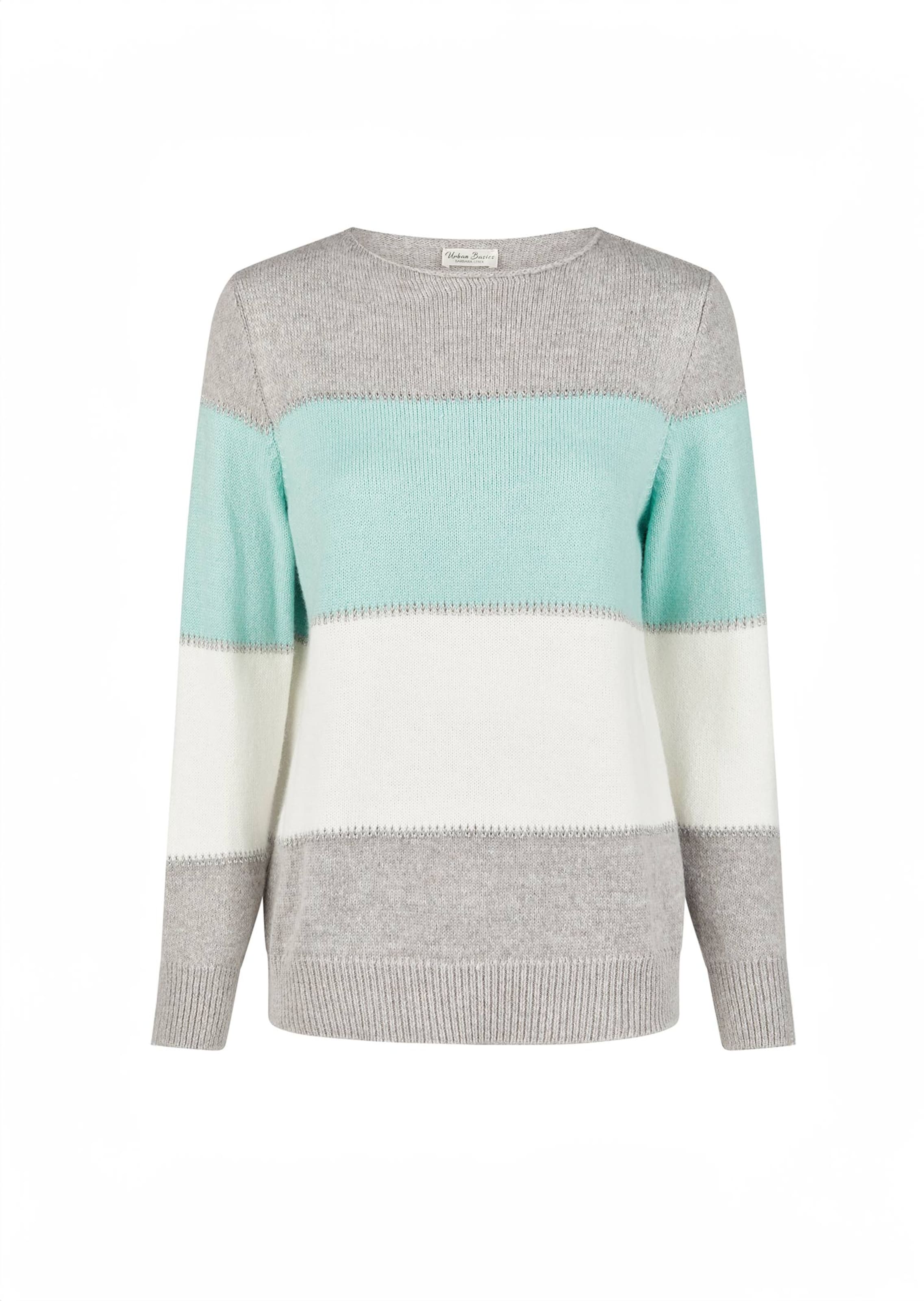 Pullover van BARBARA LEBEK in een heerlijk zachte wolmix. Het harmonieuze blokstreepdessin in klassiek recht-averechtbreisel wordt door glansgaren-highlights onderbroken. Dit model heeft een lichte boothals met een rolrand en een ribboord onderlangs en aan de lange mouwen. Lengte ca. 66 cm in maat 46.