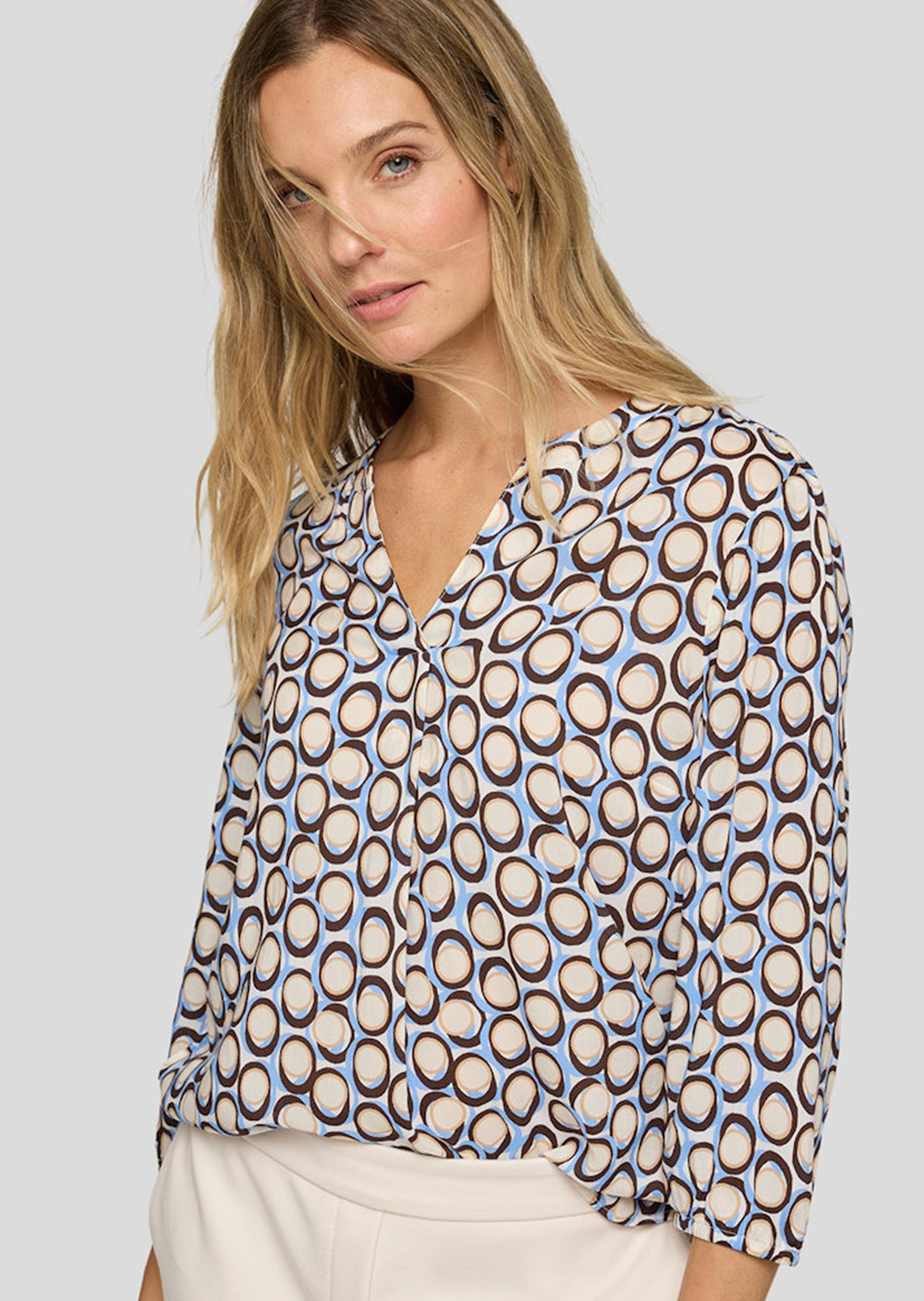 Tuniek van RABE van luchtige viscose, ideaal bij warm weer! De ronde hals loopt uit in een V en gaat dan over in een springende plooi, die voor comfortabele wijdte zorgt. De 3/4-mouwen zijn met een elastische rand afgewerkt – perfect om te bloezen. Achter iets langer, waardoor de tuniek losjes en flatteus valt. Het grafische motief zorgt voor contrastrijke accenten. Gewoon aantrekken en genieten! Lengte ca. 72 cm in maat 46.