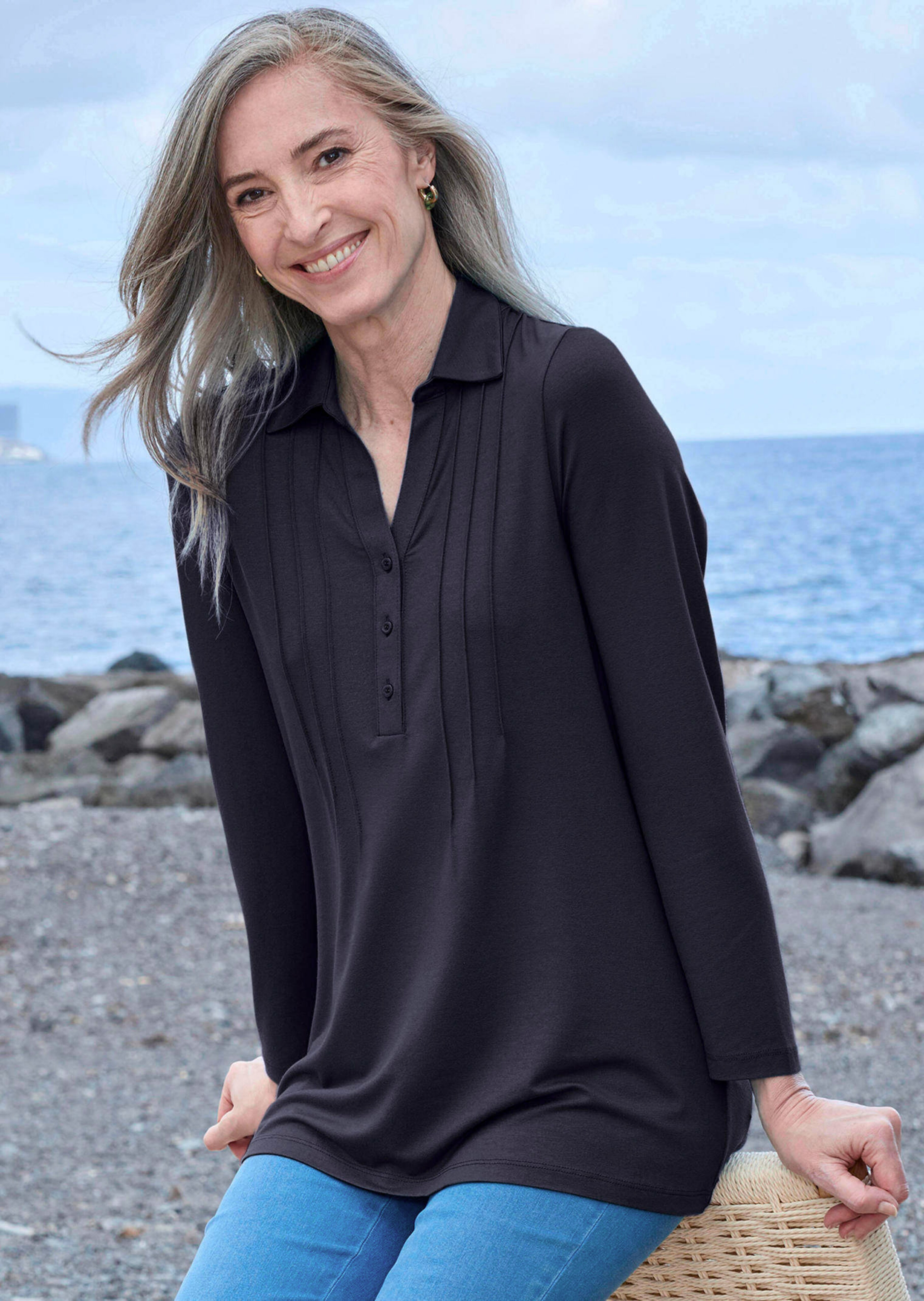 Tuniekshirt in elegante blouselook: de overhemdkraag gaat over in een V-vormig splitje. De knopenlijst tot de taille accentueert het decolleté. Biesjes aan beide kanten langs de knopenlijst zorgen voor een mooie buste en zorgen vanaf de heup voor een flatteuze wijdte. In flatteuze lengte, met lange mouwen en harmonieuze knopen. Van dichte, iets glanzende viscose-jersey. Lengte ca. 73 cm in maat 46, ca. 69 cm in maat 23.