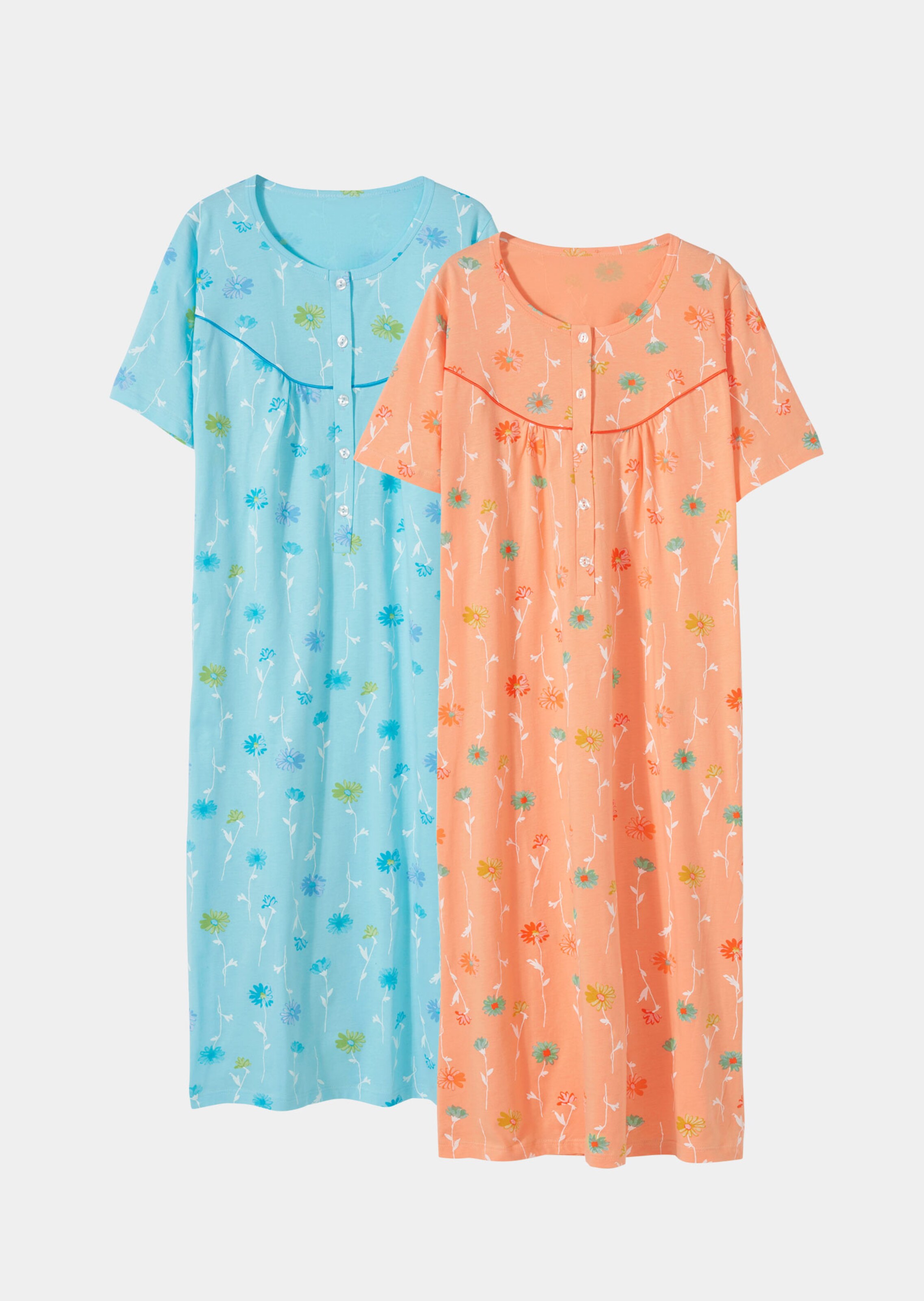 Twee nachthemden – bestel de twee trendy kleuren van dit seizoen in bloemenprint. Casual pasvorm met korte mouwen en plooien bij de borst voor een comfortabele wijdte. Met ronde hals en korte knoopsluiting. Bijzonder comfortabel dankzij puur katoen voor een optimale nachtrust!