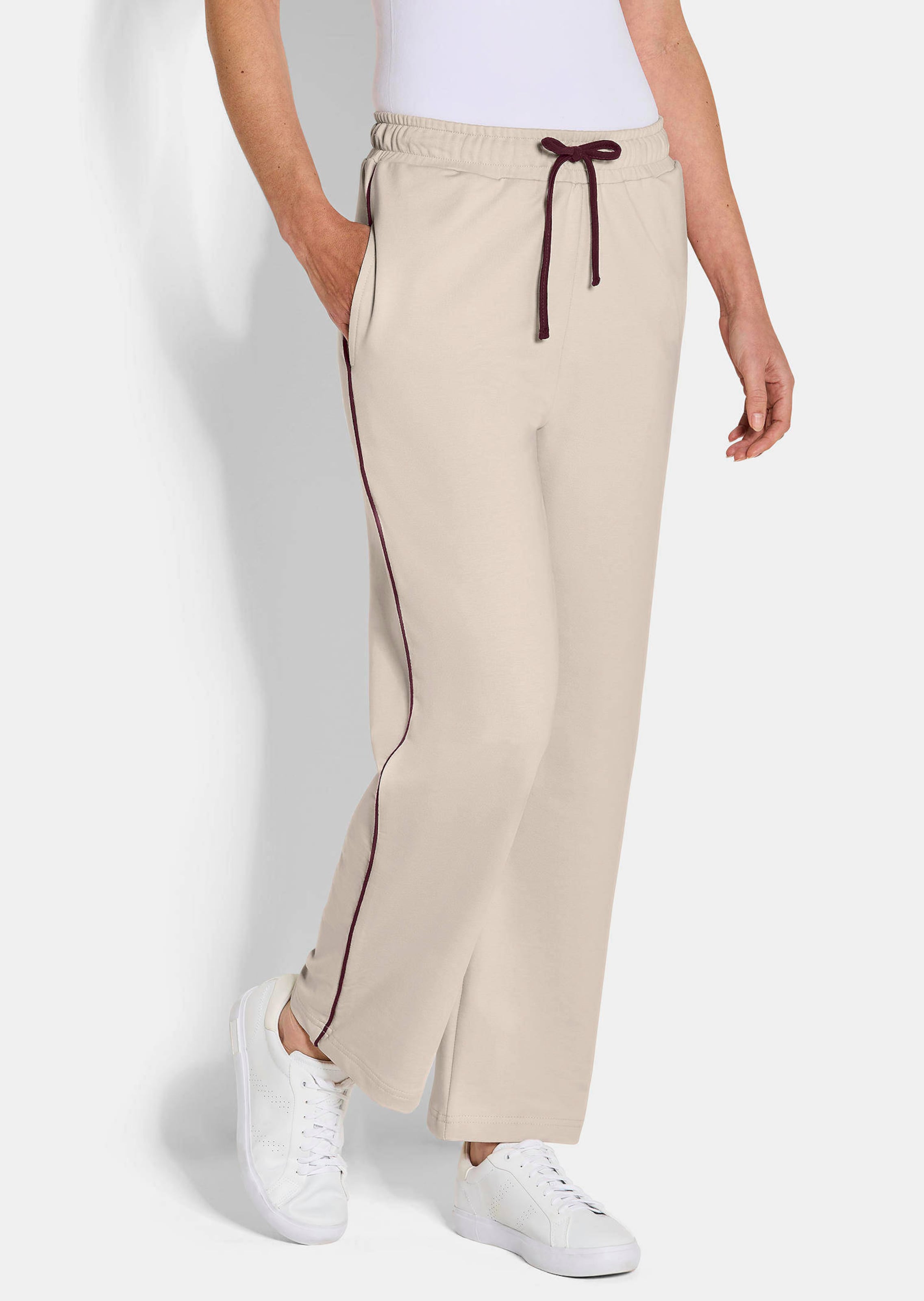 Twee vrijetijdsbroeken met rechte pijpen van PLANTIER: zowel het bordeauxkleurige als het beige exemplaar heeft contrastkleurige biezen voor een mooie look. Zacht en comfortabel van onderhoudsarme jersey met veel katoen. Blijft mooi in model dankzij Elastan. Bijzonder comfortabel dankzij de brede, elastische tailleband met strikceintuur in contrastkleur. Met 2 steekzakken opzij.
