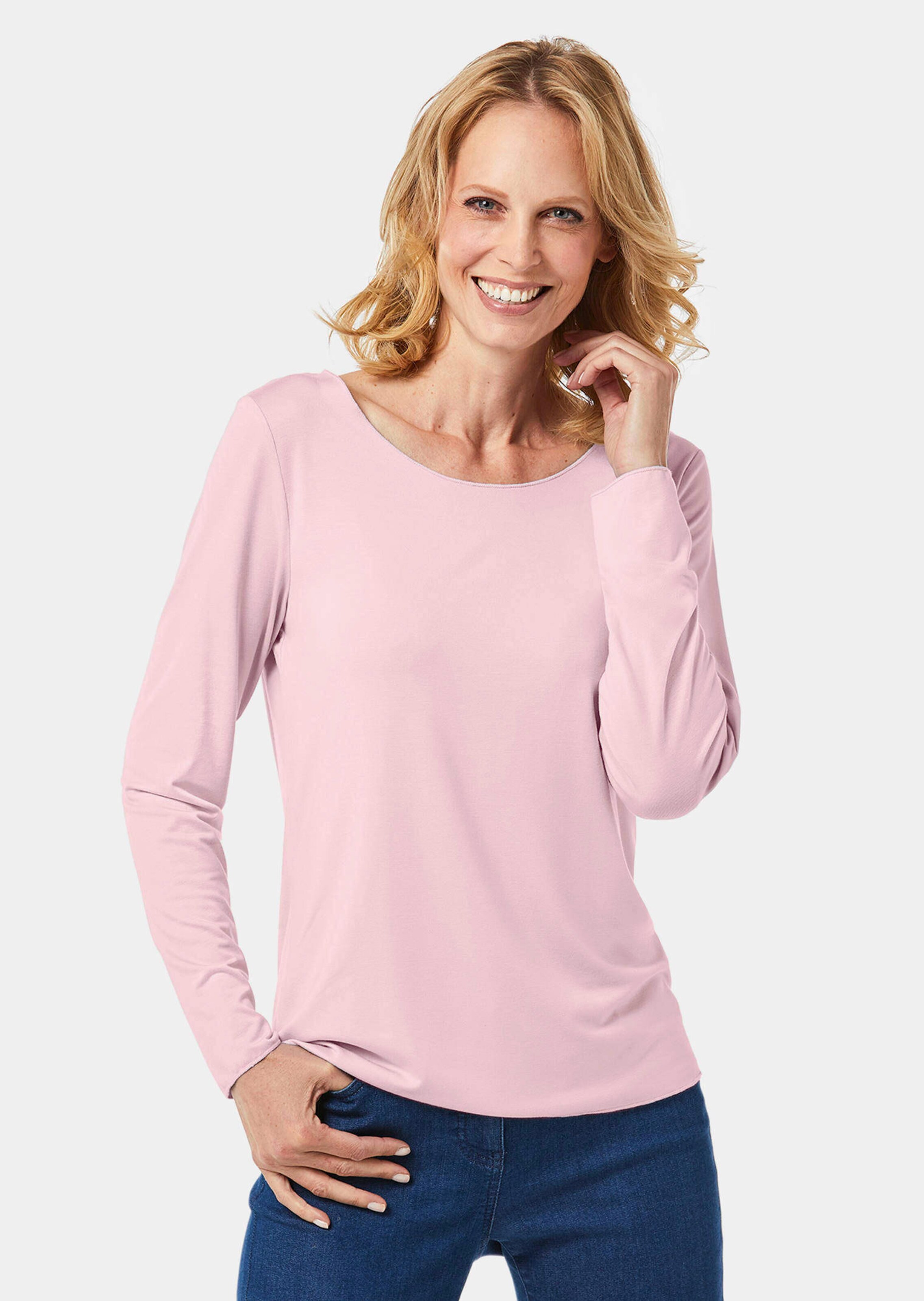 Shirt met ronde hals en prachtig detail: de elegante, ton sur ton golfrand is een stijlvolle blikvanger. Gemaakt van comfortabele single-jersey van stretchviscose voor het allerhoogste comfort. Dit veelzijdige combinatiemodel is in aantrekkelijke kleuren te bestellen. Met lange mouwen. Lengte ca. 64 cm in maat 46, ca. 60 cm in maat 23.