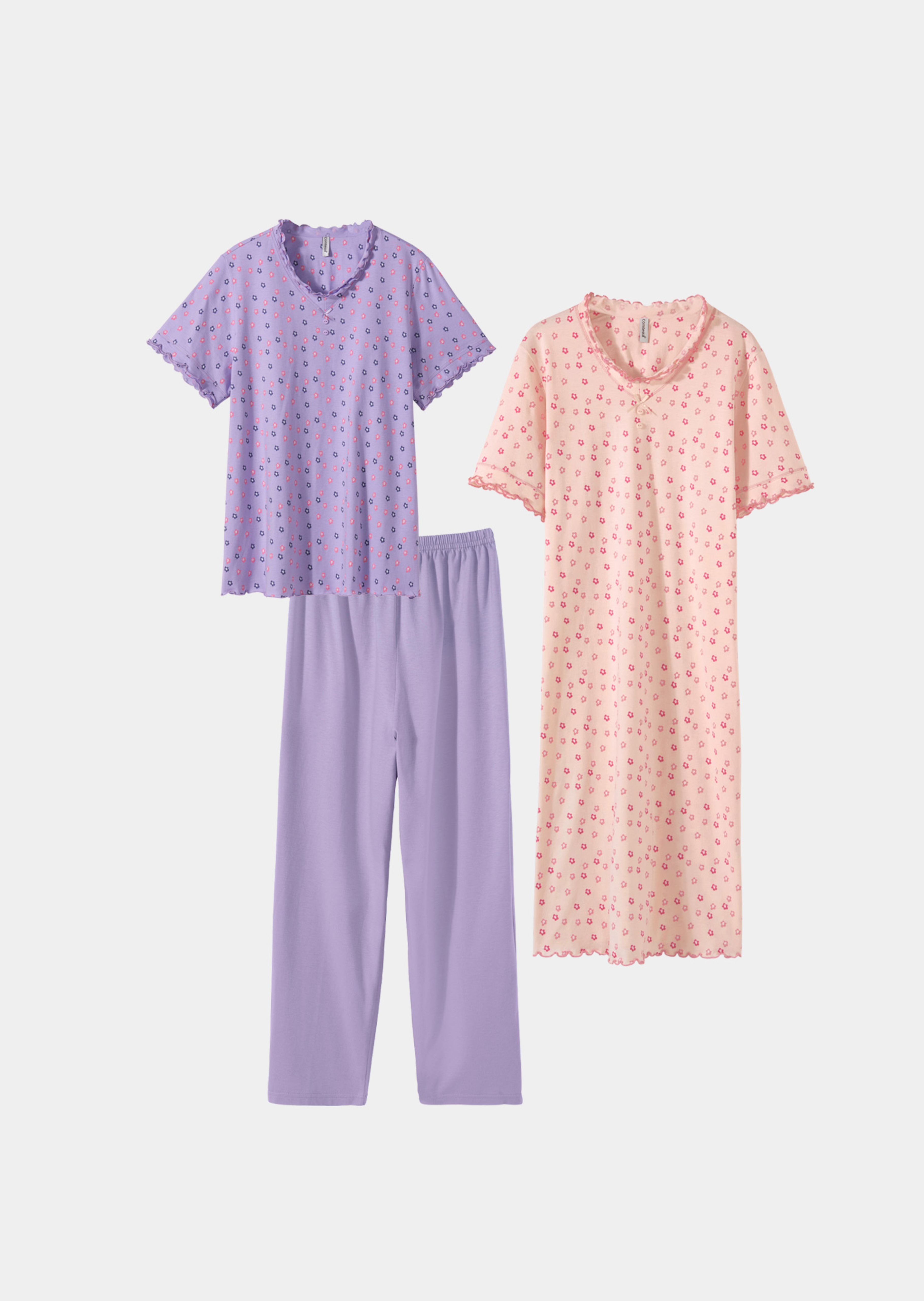 Nachtwäsche-Set 3-teilig von COMTESSA, bestehend aus Pyjama und Nachthemd in femininer Optik. Schlafanzug-Oberteil und Nachthemd mit V-Ausschnitt und gewellten Abschlüssen, auch das gemusterte Dessin setzt romantische Akzente. Die Hose in 7/8-Länge trägt sich dank abgestepptem Gummibund und Seitenschlitzen äusserst komfortabel. In weicher Verwöhnqualität aus Baumwoll-Jersey.