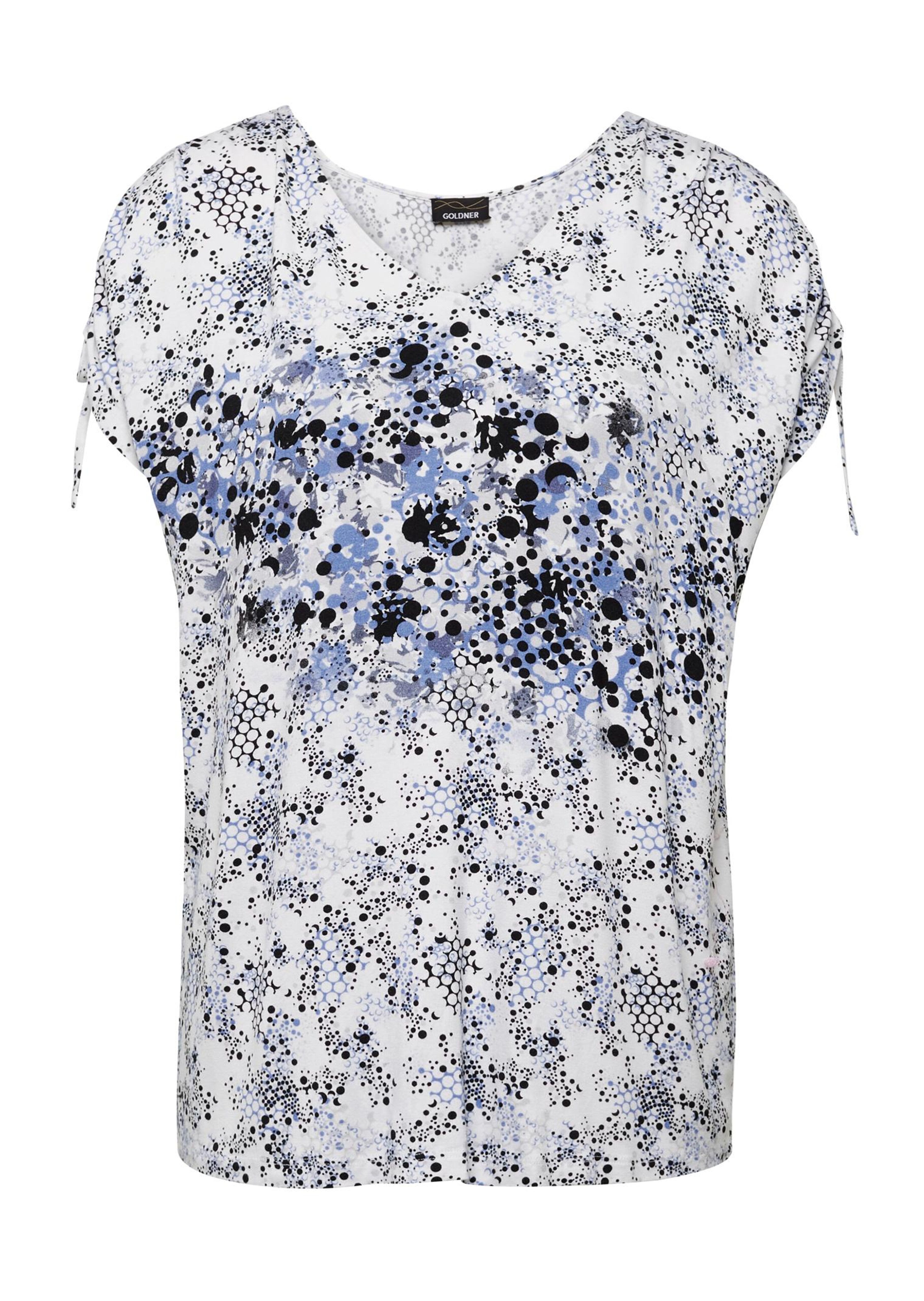 Druckshirt mit faszinierendem Mustermix in sanfter Farbigkeit. Fühlen Sie die hautsympathische Viskose-Stretch-Qualität – sie trägt sich superweich und leicht. Überaus charmant zeigen sich die dekorativen Bänder an den überschrittenen Schultern zum Raffen. Mit bequemem, femininem V-Ausschnitt. Länge ca. 64 cm in Gr. 46, ca. 60 cm in Gr. 23.