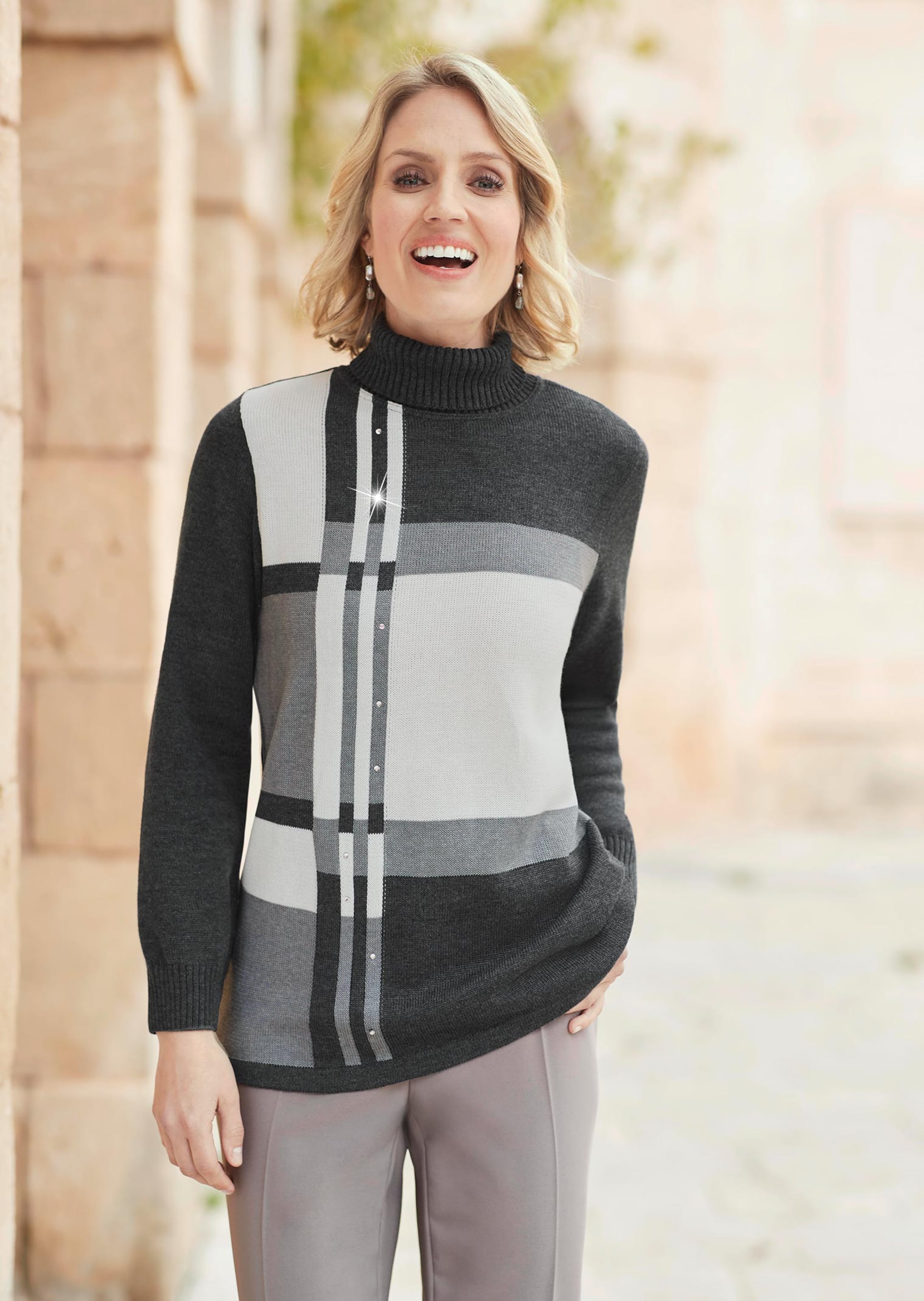Pullover, der mit sehr schönem, geometrischem Muster im Vorderteil sportlich und feminin zugleich wirkt. Das Dessin mit Glitzersteinchen sorgt zudem für eine streckende und elegante Optik. Lockerer Schnitt mit trageangenehmem Rollkragen und langen Ärmeln. Der Pullover ist herrlich unkompliziert dank der pflegeleichten Qualität mit hohem Baumwollanteil. Länge ca. 70 cm in Gr. 46, ca. 66 cm in Gr. 23.