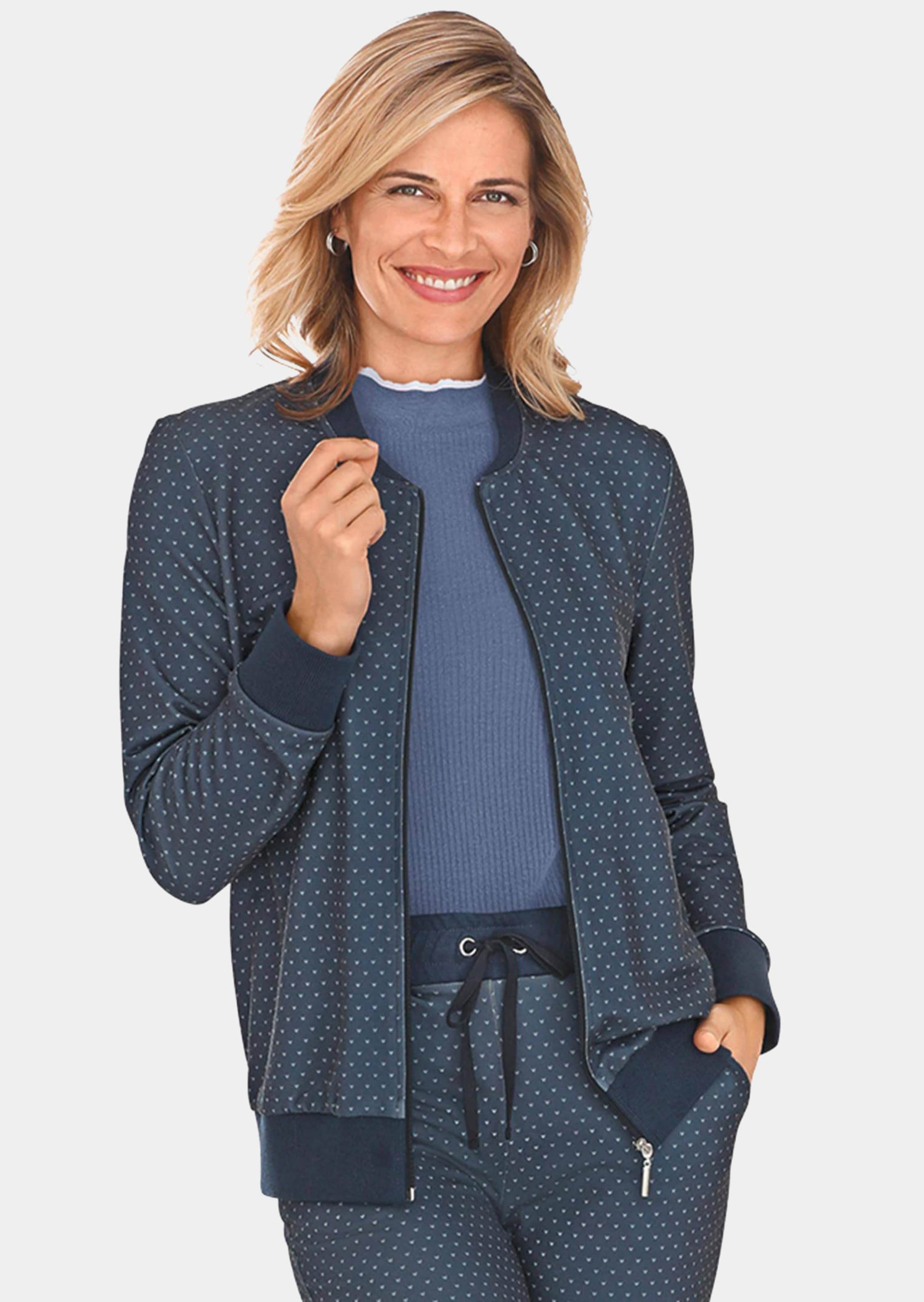 Wohlfühljacke in sportlicher Blousonform. Der Minimalprint in Strick-Optik ist modisches Detail. Die trageangenehme Qualität mit Baumwolle an der Innenseite ist flauschig weich. Der Elasthan-Anteil sorgt für Formstabilität und macht die Jacke besonders pflegeleicht. Mit unifarbenen Bündchen an Ausschnitt, Saum- und Ärmelabschluss sowie einem durchgehenden Reissverschluss mit silberfarbenem Anhänger. Länge ca. 70 cm in Gr. 46, ca. 66 cm in Gr. 23.