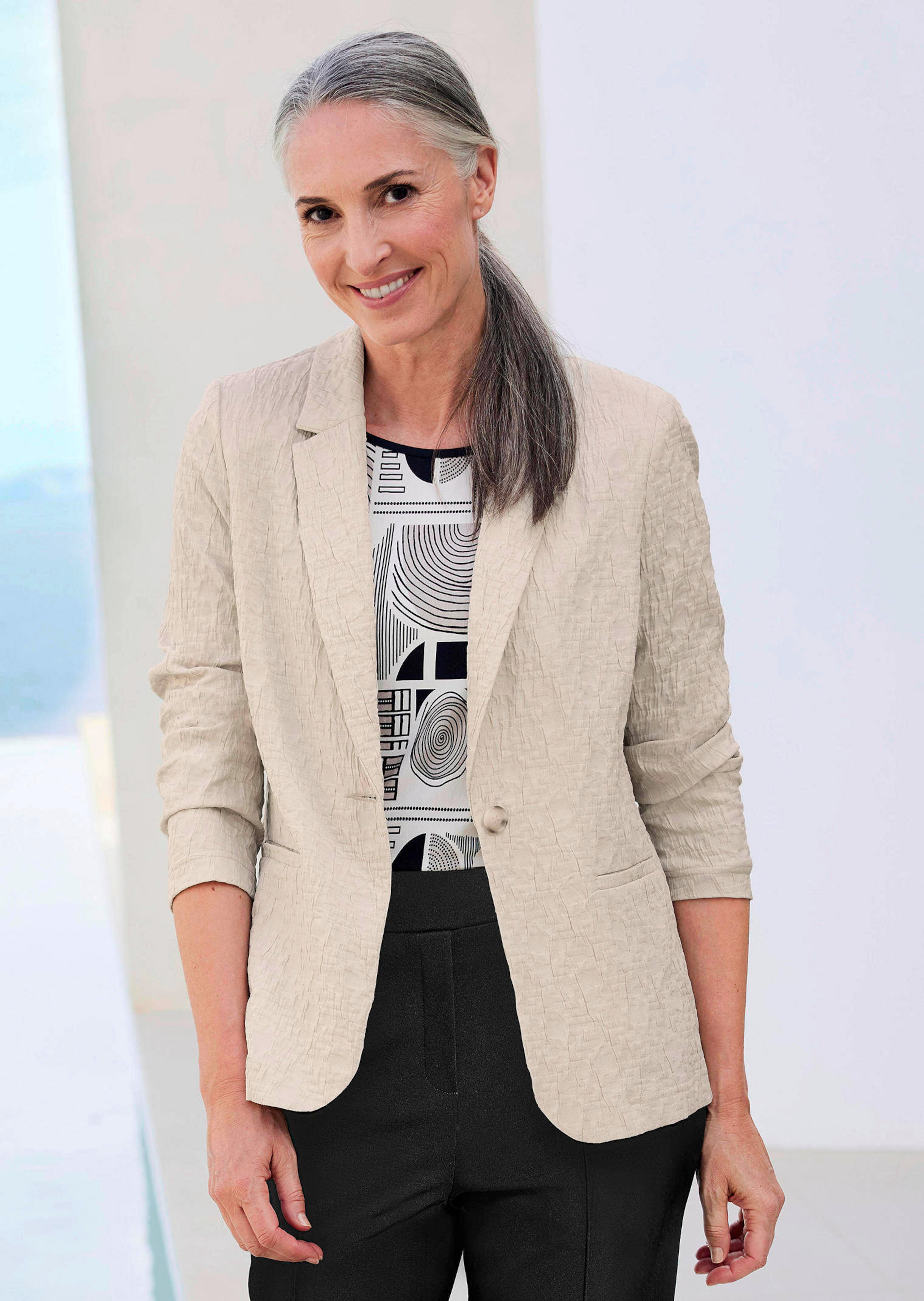 Blazer aus spannender Strukturware, der sich in raffinierter Optik gekonnt in Szene setzt. Ungefüttert trägt er sich herrlich leicht, das elastische Material sorgt für einen bequemen Sitz. Mit Reverskragen und Knopfverschluss. 2-Naht-Ärmel und Leistentaschen verleihen ihm eine klassische Note. Der Blazer ist ein Kombitalent für viele Stile, ob elegant oder leger: Damit sind Sie immer gut angezogen! Länge ca. 70 cm in Gr. 46, ca. 66 cm in Gr. 23.