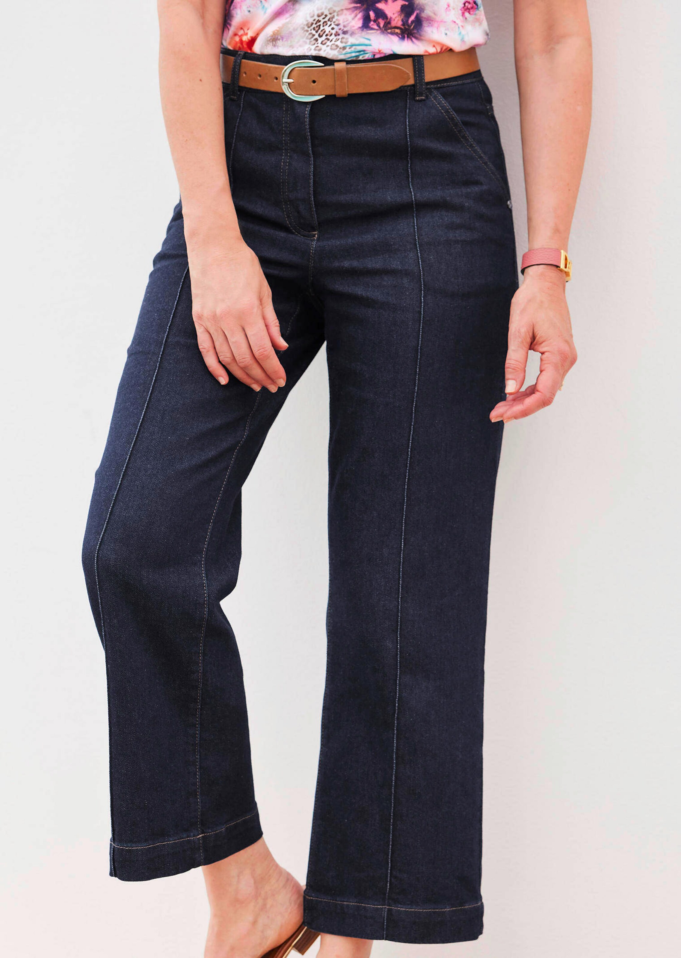 Jeans VERA mit Formbund und Gürtelschlaufen. Der metallfarbige Knopf und die Kontrastnähte verleihen der Jeans ihren typischen Look. Das weite Bein ist mit einer streckenden Biese gearbeitet und leicht verkürzt. Ein klassisches Denim-Modell aus stretchbequemer Baumwoll-Qualität ohne Waschung, so behält es seine intensive, dunkle Färbung. Saumweite ca. 56 cm. Weiter Beinverlauf.
