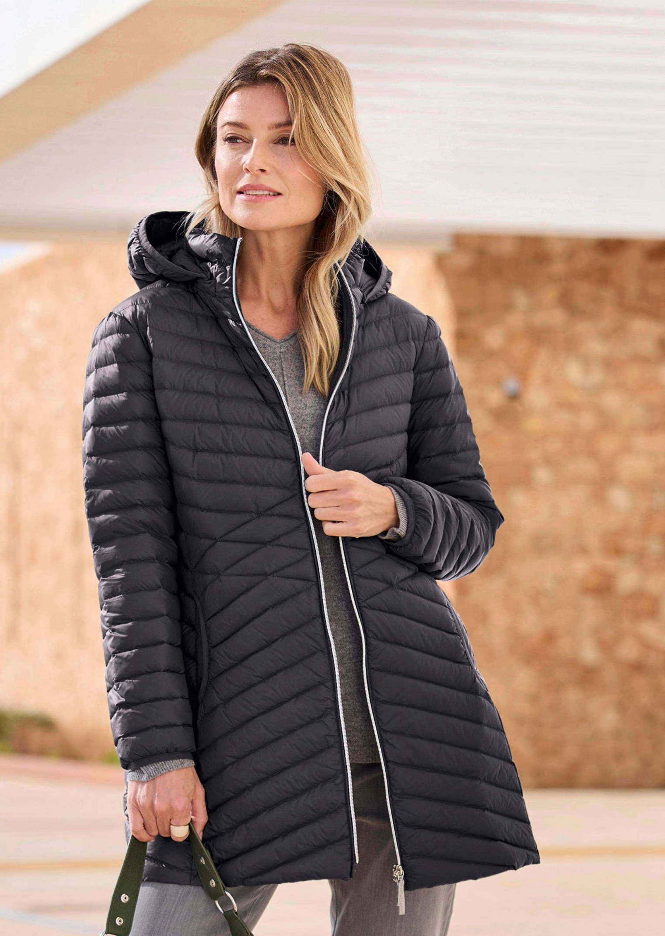 Steppmantel mit warmer Daunen-Feder-Füllung – ein echtes Leichtgewicht und damit perfekt für unterwegs! Die längere Passform mit Stehkragen und Kapuze wärmt rundum, ein 2-Wege-Reissverschluss sorgt für besten Tragekomfort, auch beim Sitzen. Mit elastischen Bündchen an der Kapuze und den Tascheneingriffen. In figurschmeichelnder Steppung für eine feminine Optik. Länge ca. 83 cm in Gr. 46, ca. 79 cm in Gr. 23.