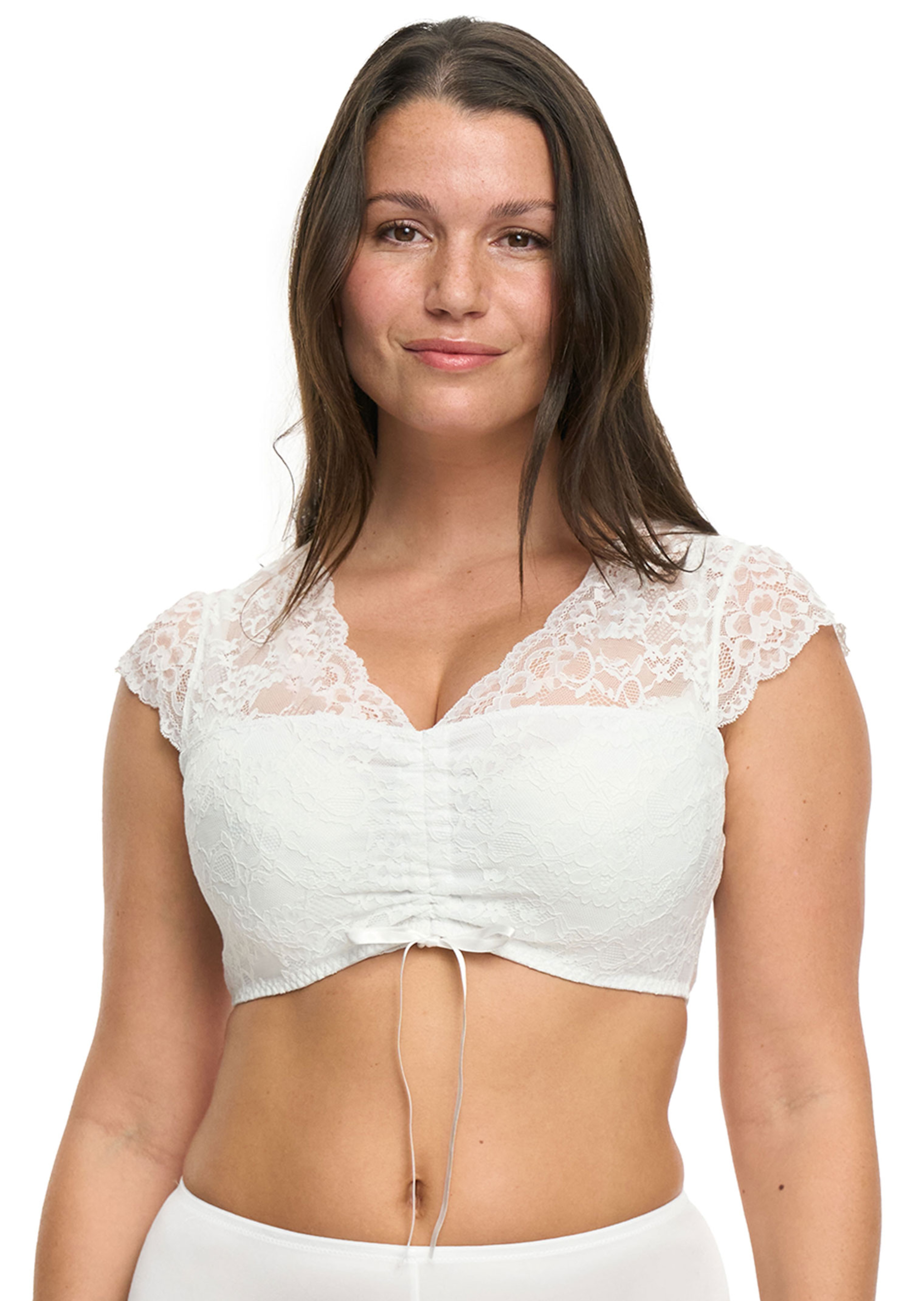 Dirndlbluse mit kurzen Flügelarm von der Marke Susa aus der Serie Wiesn-Zauber. Besondere Merkmale des Artikels sind die florale Spitze, der blickdicht gefütterte Brustbereich und der elastische Saum und Rückenausschnitt. Die Raffung in der Cupmitte kann mit einem Satin-Bindeband variabel gezogen werden. Die stilvolle und feminine Dirndlbluse ist ein modisches Dessous aus weichem Materialen, ein Muss unter jedes Dirndl.