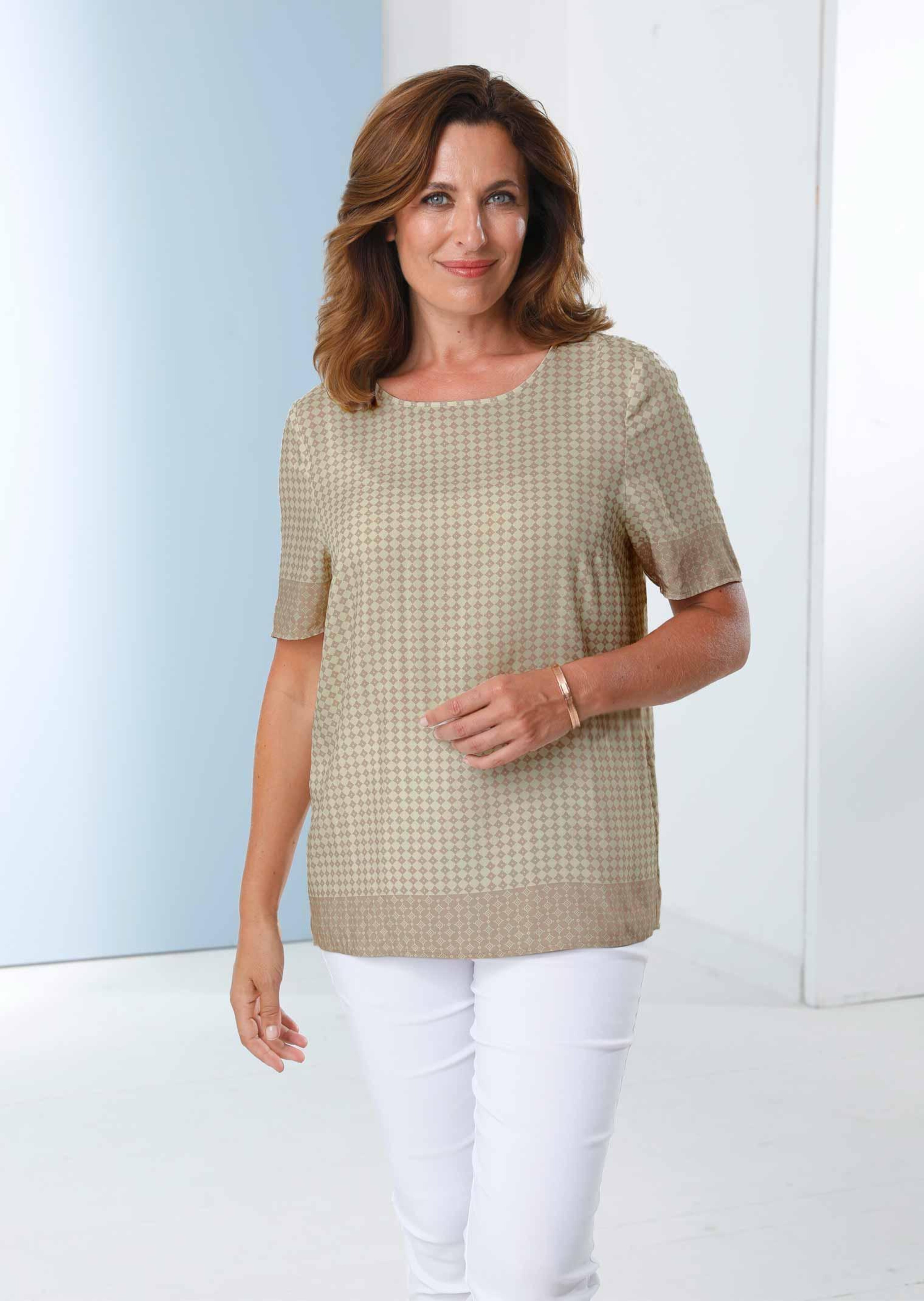 Druck-Schlupfbluse in hochwertiger Atelier-Konfektionierung. Der modische Druck mit geometrischem Muster und BordĂ¼re an halblangen Ă„rmeln und am Saum verleiht dem Modell seinen ganz besonderen Reiz. Dabei ist das Dessin absolut passgenau gearbeitet – selbst an den Nähten läuft das Muster exakt ineinander Ă¼ber. Das RĂ¼ckteil ist mit einem Knopfverschluss versehen und ermöglicht damit einfaches An- und Ausziehen. Aus weich fliessender, trageangenehmer Viskose. Länge ca. 66 cm in Gr. 46, ca. 62 cm in Gr. 23.