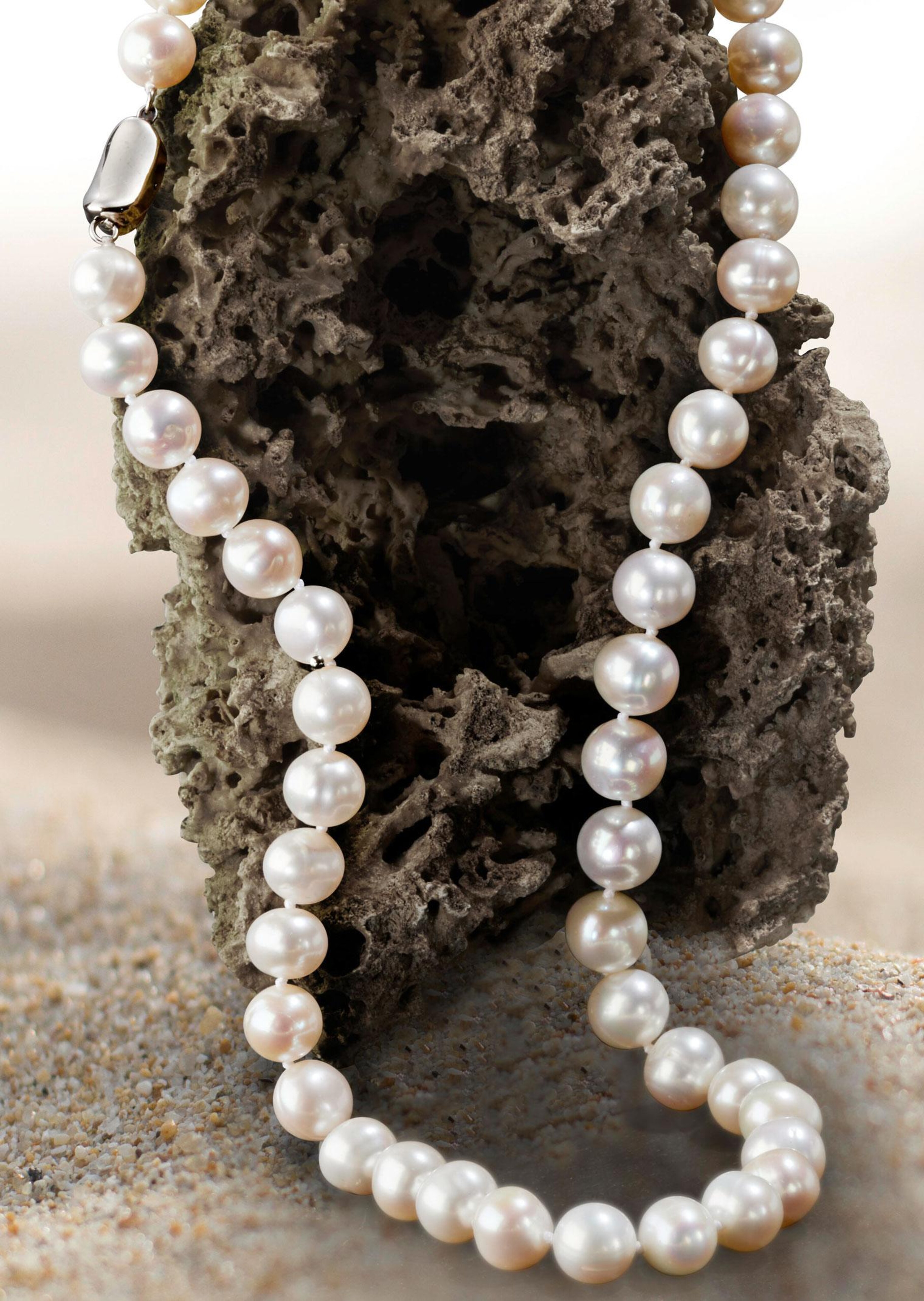 Süsswasserperlenkette: Eine aparte Kette mit echten Süsswasserperlen, die mit einem herrlichen Schimmer bezaubern. Eleganter Verschluss aus 925er Sterling-Silber. Lieferung in wunderschöner, schwarzer Samt-Schatulle. Länge ca. 48 cm ohne Verlängerung.