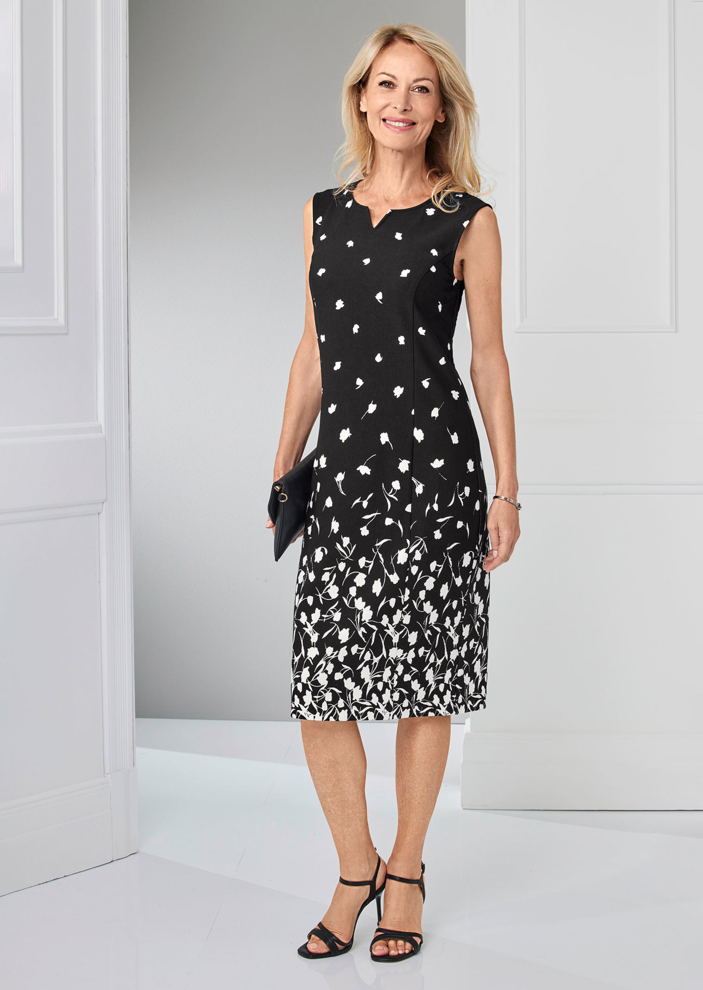 Druckkleid mit aussergewöhnlichem Muster: Die floralen Elemente wirken am Saum wie eine Blumenranke und laufen nach oben hin in einzelne Blütenblätter aus – ein toller Effekt. Die leicht strukturierte, ungefütterte Jerseyware schenkt besten Tragekomfort. Wiener Nähte garantieren dabei perfekte Passform. Mit nahtfeinem Reissverschluss hinten. Länge ca. 102 cm in Gr. 46, ca. 96 cm in Gr. 23.