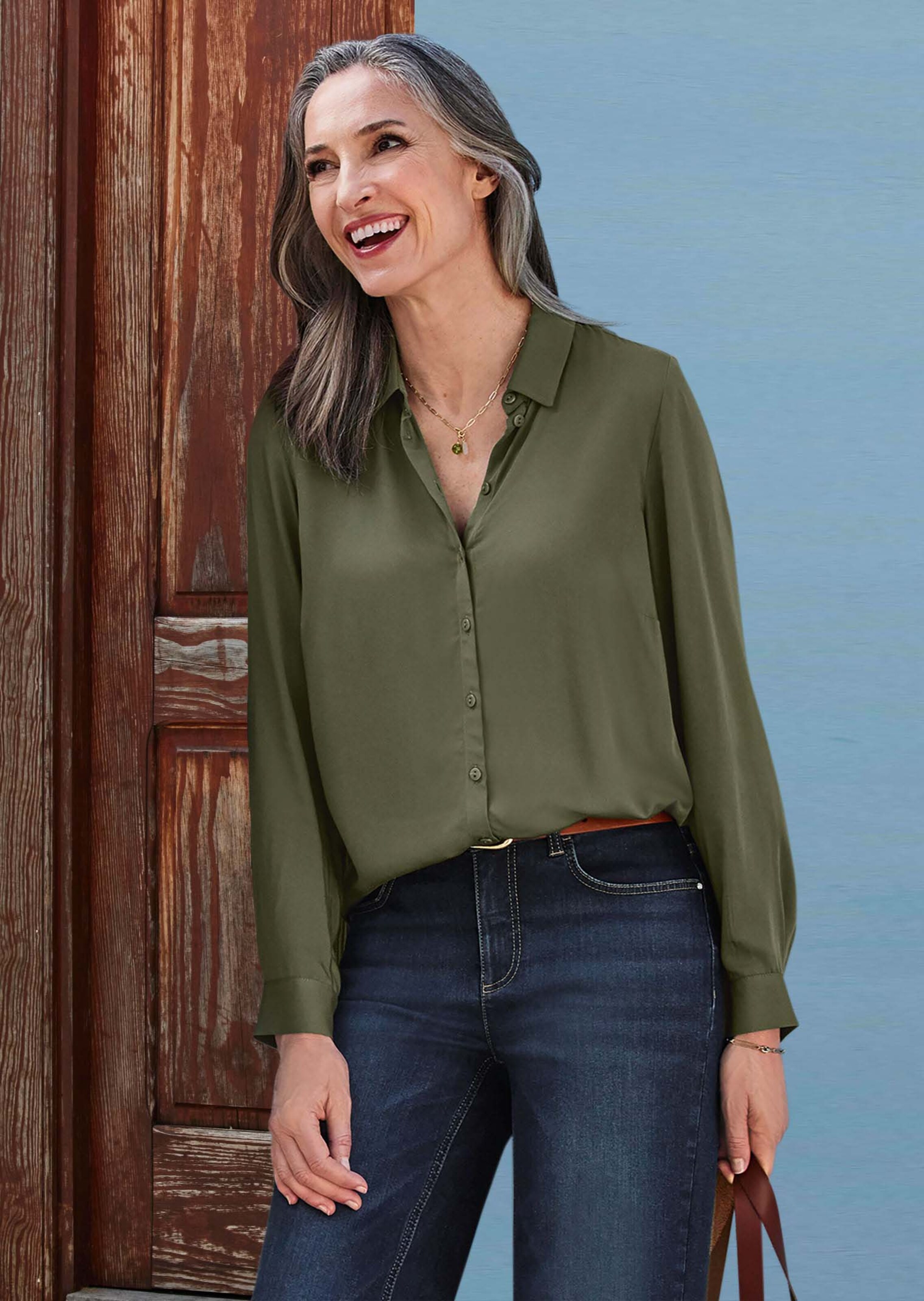 Hemdbluse aus reiner Viskose. Begeistert mit seidigem Glanz und geschmeidig fließendem Fall. Die edle Naturfaser lässt die Farben strahlen und trägt sich wunderschön auf der Haut. Stilgerecht verarbeitet zeigt sich die Bluse mit Hemdkragen, durchgehender Knopfleiste sowie Manschette am Ärmelabschluss mit Knopf und kleinem Schlitz. Bewegungsfalte am Rückteil gibt angenehme Weite. Der Saum ist abgerundet. Länge ca. 71 cm in Gr. 46, ca. 69 cm in Gr. 23.