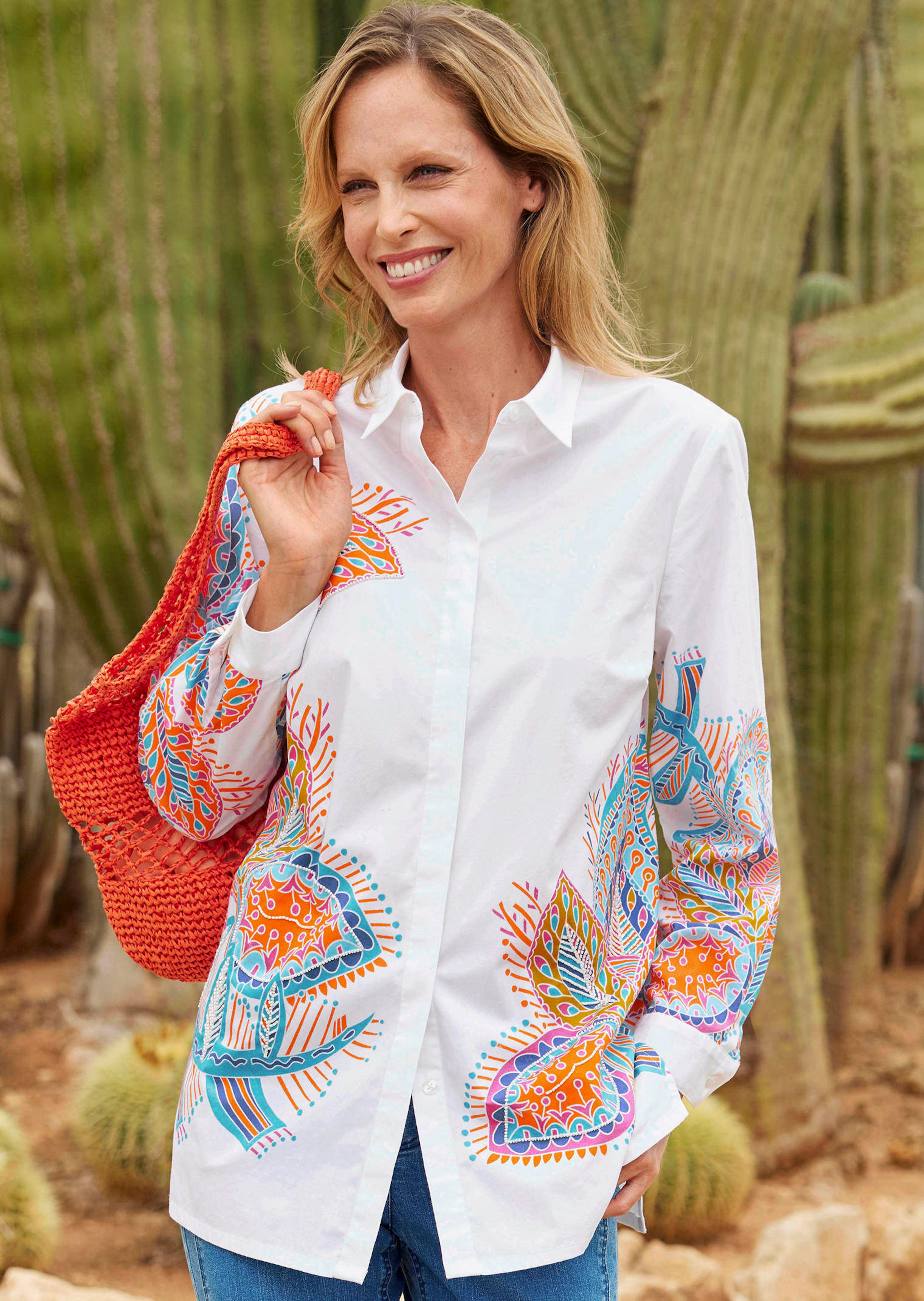 Bluse mit Blickfang-Print: Die partiell platzierten Blätter in leuchtenden Farben sind aufwändig mit kleinen Perlen bestickt und machen die Bluse zum Highlight-Modell der Saison. Mit Hemdkragen und verdeckter Knopfleiste. Die langen Ärmel sind mit Manschetten gearbeitet und lassen sich auf 3/4-Höhe mit einem Riegel und Knopf fixieren. Längere, figurumspielende Passform mit Seitenschlitzen. Aus stretchbequemer Qualität mit viel Baumwolle. Länge ca. 76 cm in Gr. 46, ca. 72 cm in Gr. 23.