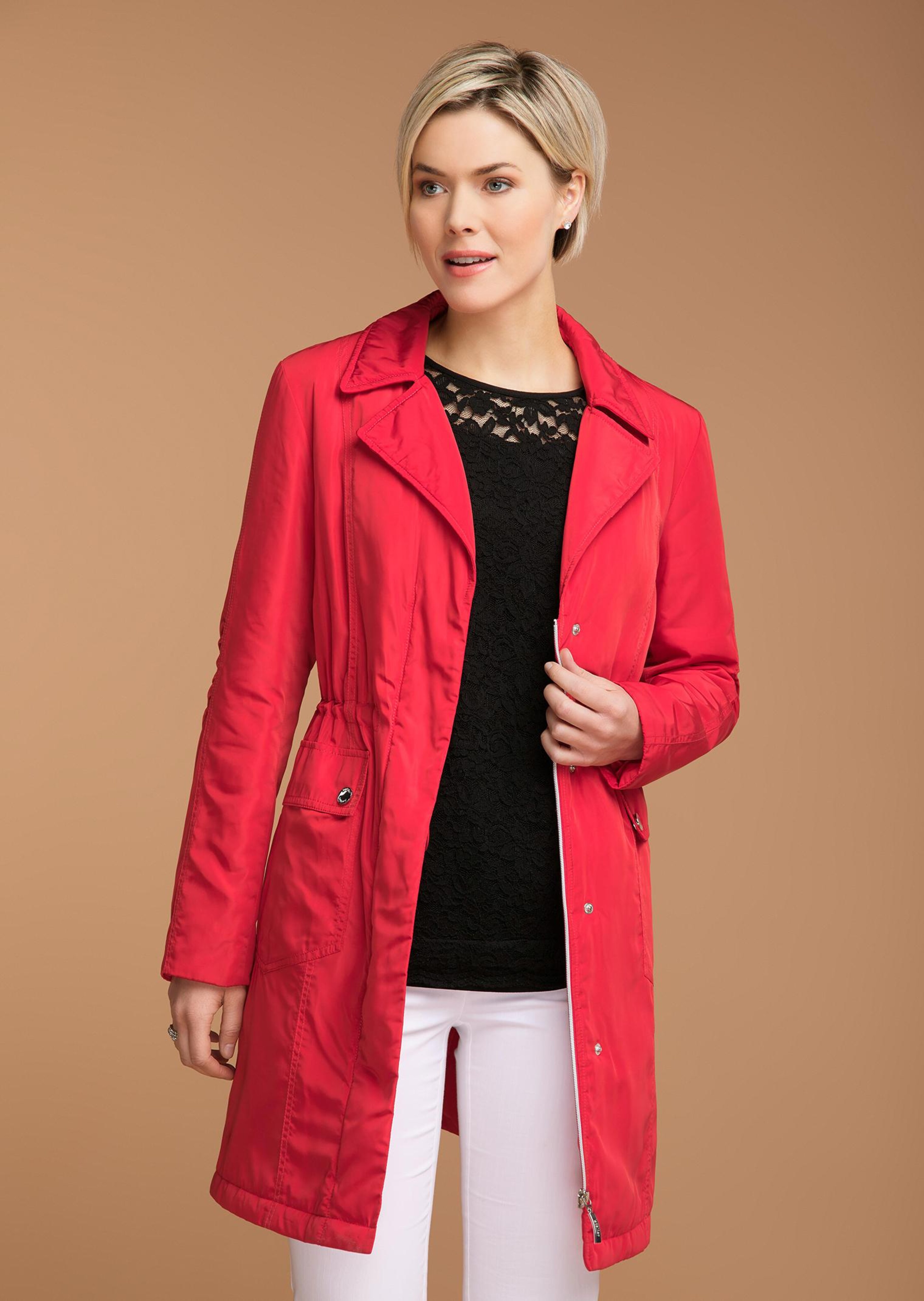 Trenchcoat in leichter, wattierter Qualität. Mit dezenten Raffungen im Ärmelbereich und aufgesetzten Pattentaschen. Tunnelzug in der Taille zur Weitenregulierung. Teilungsnähte für perfekten Sitz. Rückseite mit Gehschlitz für optimale Bewegungsfreiheit. Mit Futterinnentasche. Mit Reissverschluss und Druckknöpfen zu schliessen. Länge ca. 88 cm in Gr. 46, ca. 84 cm in Gr. 23.
