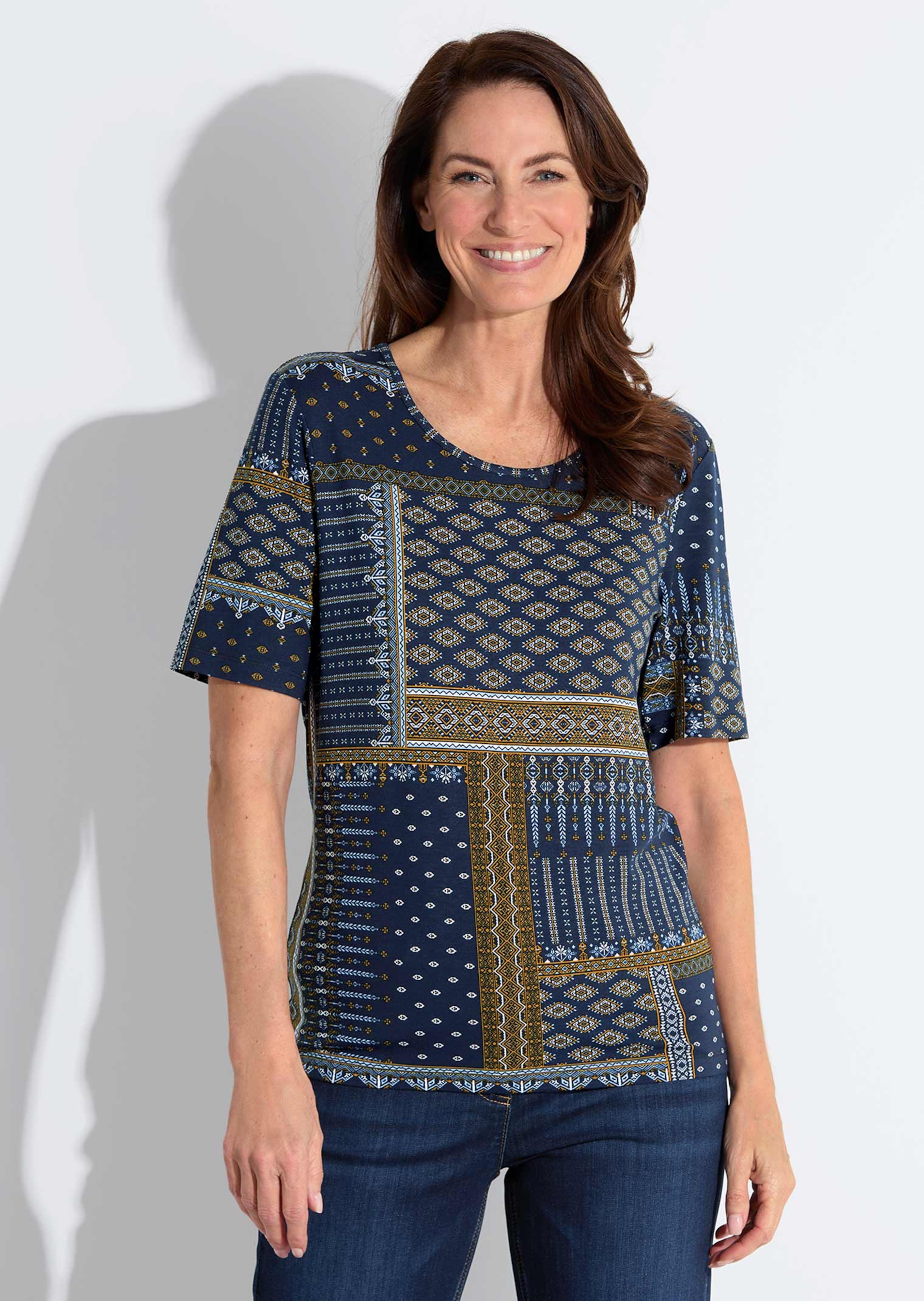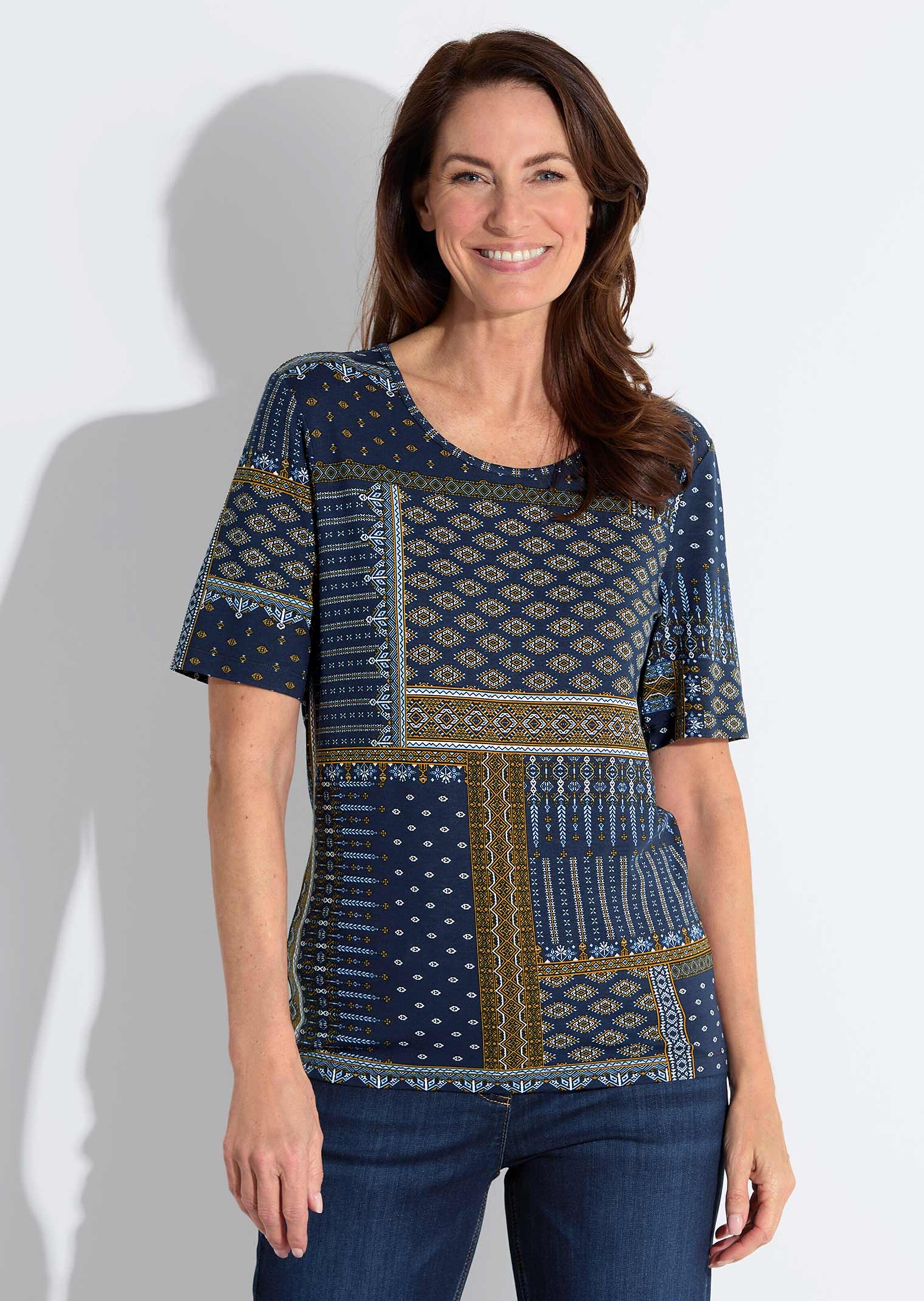 Shirt aus pflegeleichtem Viskose-Jersey mit Rundhalsausschnitt und Halbarm. Das Modell in figurnaher Passform sitzt wunderbar bequem. Edles geometrisches Dessin in harmonischen Farben. Länge ca. 64 cm in Gr. 46, ca. 60 cm in Gr. 23.