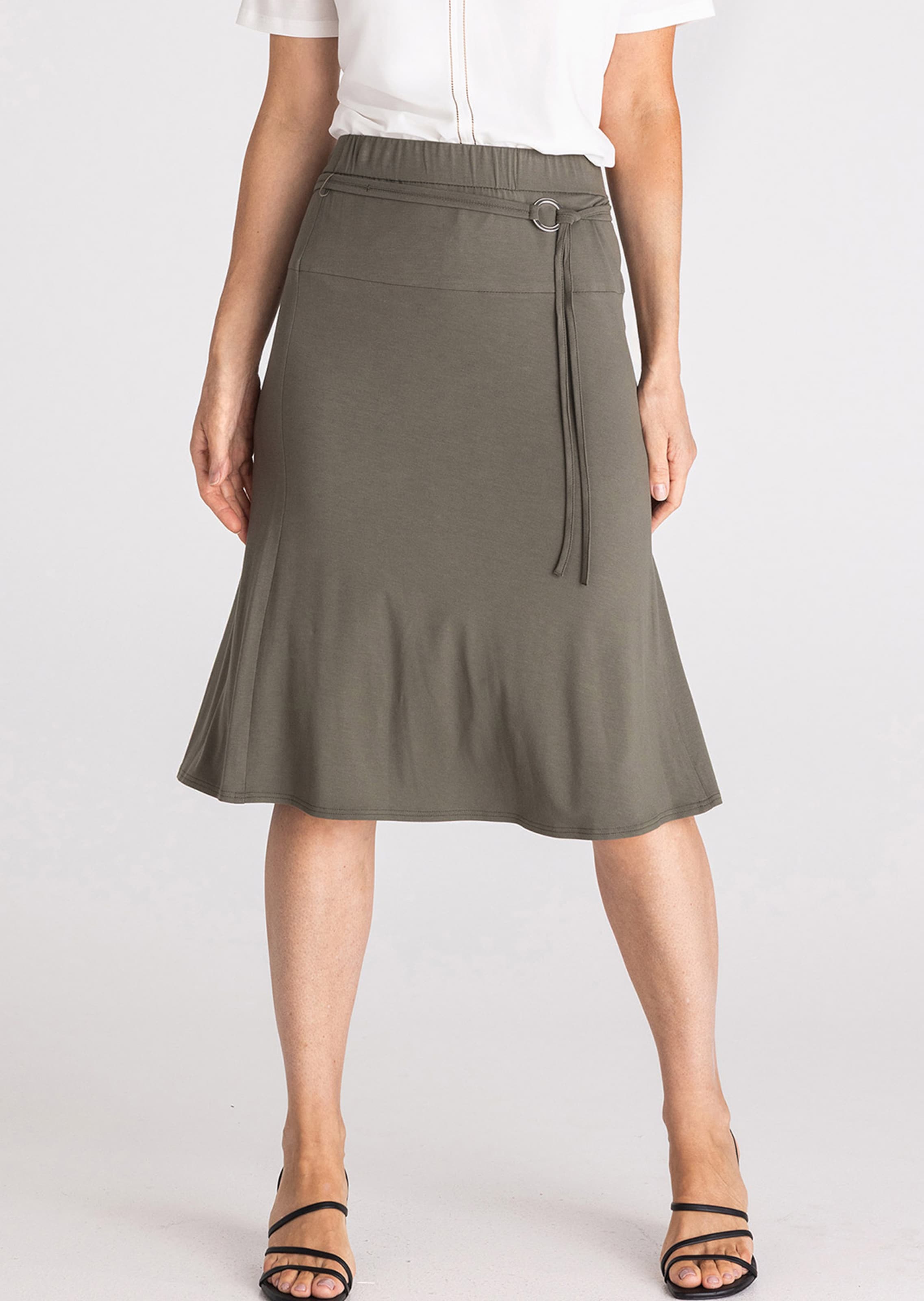 Jerseyrock von FRANK WALDER aus einer weichen Viskosequalität, die sich stretchbequem trägt und den sanften Schwung des ausgestellten Modells unterstreicht. Dank Passe und Rundum-Schlupfbund formt der Rock eine schöne Silhouette und engt nicht ein. Raffinierter Blickfang: Der zweigeteilte Jersey-Gürtel mit dekorativem, silberfarbenem Ring, den Sie ganz individuell stylen können. Länge ca. 67 cm in Gr.46.