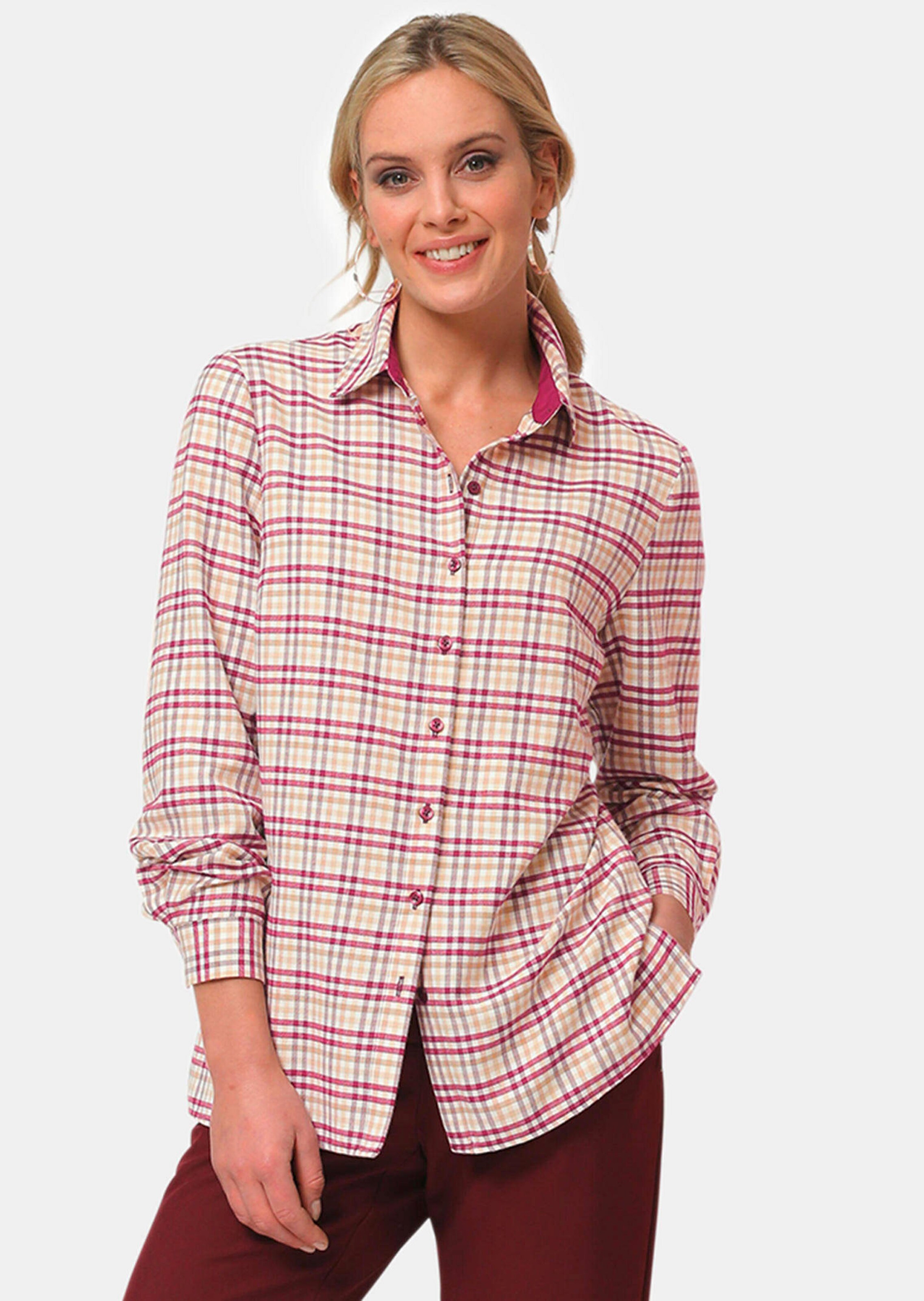 Karobluse aus weichem Flanell mit hohem Baumwollanteil. Kann sowohl klassisch als Bluse oder als leichte Überjacke mit einem T-Shirt darunter getragen werden. Kuschelig und wärmend lässt sie sich mit dem schönen Karo-Dessin in frischen Farben ganz unkompliziert kombinieren. Der unifarbene Beleg an der Krageninnenseite ist ein wertiges Detail. Länge ca. 69 cm in Gr. 46, ca. 65 cm in Gr. 23.