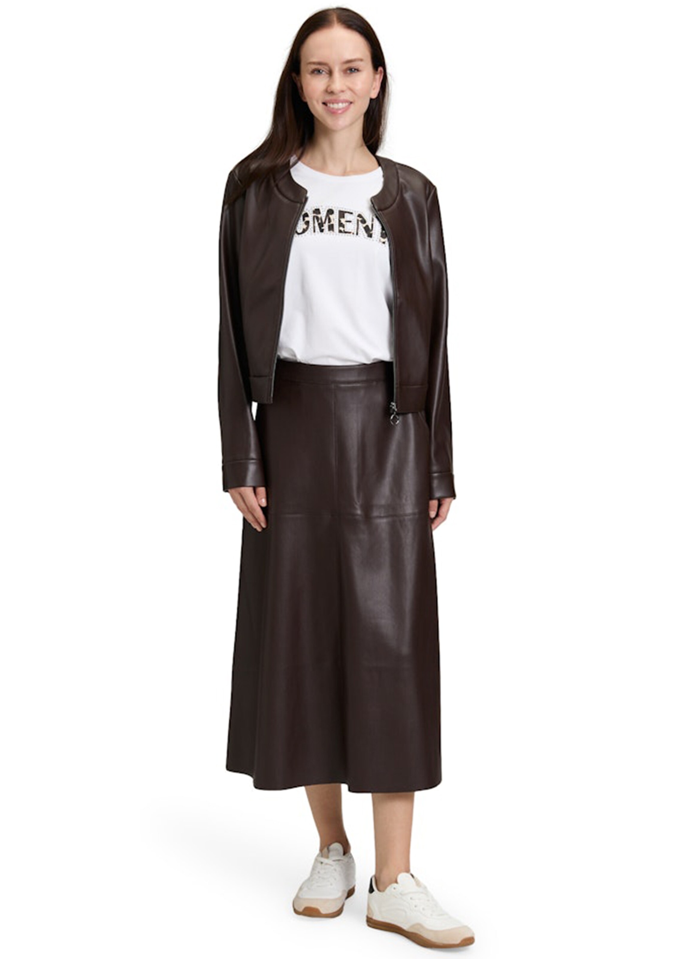 Kurzjacke von BETTY BARCLAY aus weichem Lederimitat – modisch ein Hit! Die verkürzte Form passt perfekt zu Kleidern oder Hosen, Brustabnäher geben dem Modell eine feminine Form. Mit Rundhalsausschnitt, langen Ärmeln mit Manschette und Druckknopf und Reissverschluss. Länge ca. 60 cm in Gr. 46.