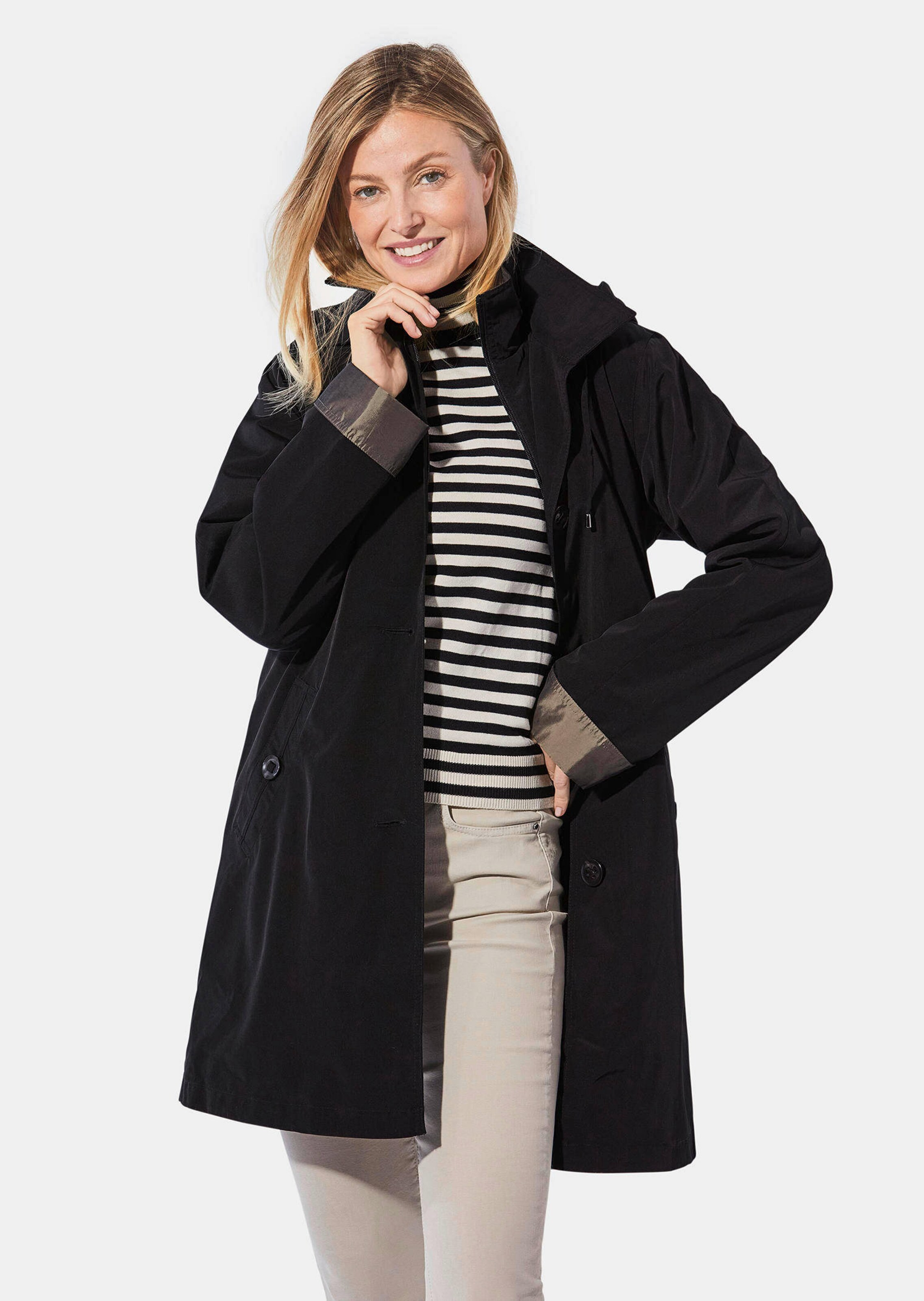 Kurzmantel in raffiniertem 2-in-1-Look: Das warme Futter wirkt wie eine integrierte Jacke und ist herausnehmbar – perfekt bei Temperaturschwankungen. Der praktische Reissverschluss wird von einer 3-Knopf-Leiste überdeckt und endet in einem Stehkragen. Die abnehmbare Kapuze mit Tunnelzug setzt sich dank kontrastfarbigem Futter gekonnt in Szene, auch die Ärmelaufschläge werden so zum Blickfang. In gerader Passform mit Eingrifftaschen, die anhand eines Knopfes zu schliessen sind. Aus wind- und wasserdichtem Material schützt der Kurzmantel vor jedem Wetter und kleidet Sie dennoch stets stilvoll! Dieses Modell fällt eine Nummer kleiner aus. Bitte bestellen Sie diesen Mantel eine Nummer grösser als gewohnt.