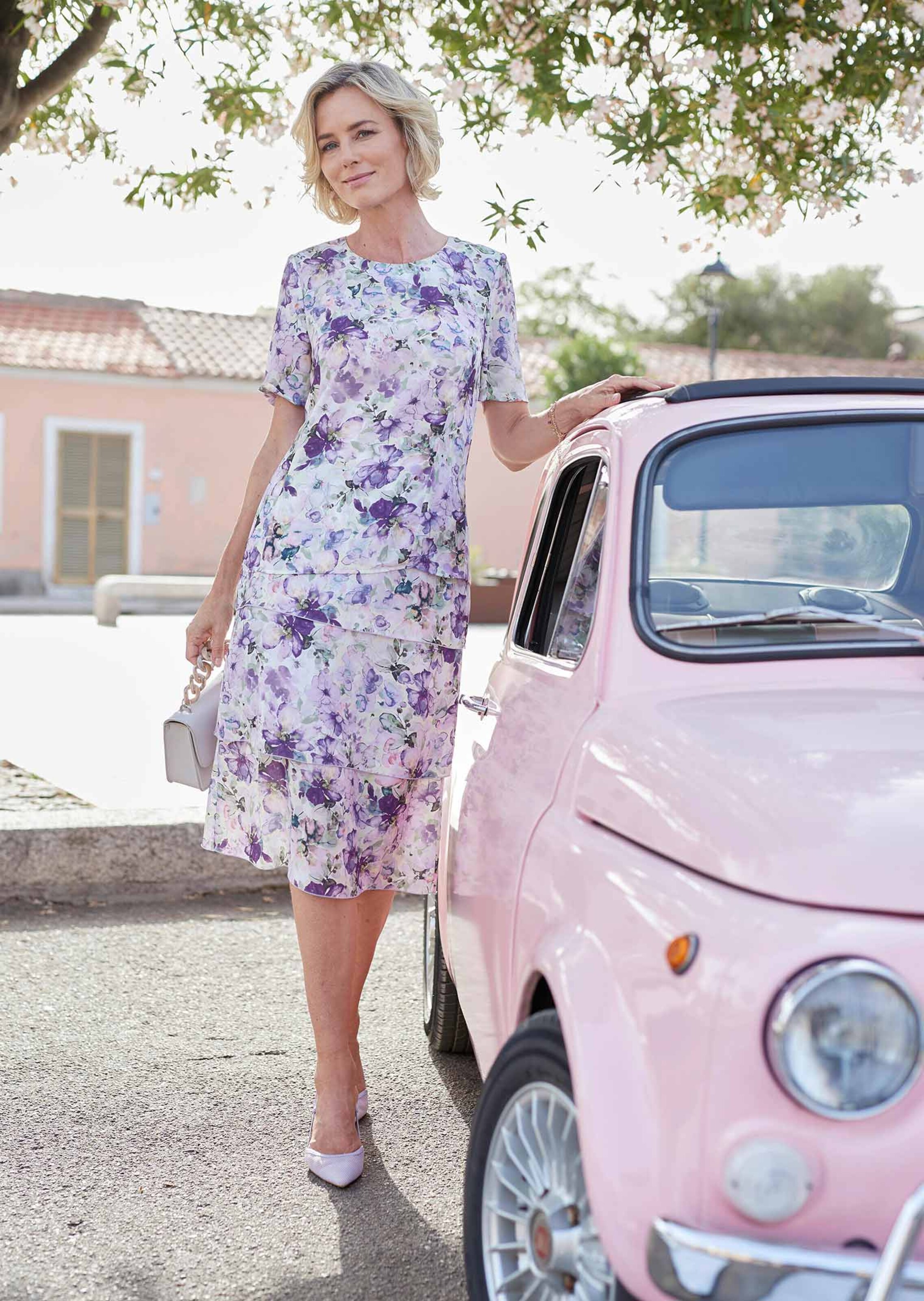 Druckjupe in leicht schwingender Form. Das duftige Zusammenspiel von traumhaftem Blumenmuster und weich fallenden Stufen wirkt wunderbar feminin. Sehr bequem ist der teilelastische Bund, der hinten mit Knopf und verdecktem Reissverschluss gearbeitet ist. Das Modell ist angenehm pflegeleicht und gefüttert.