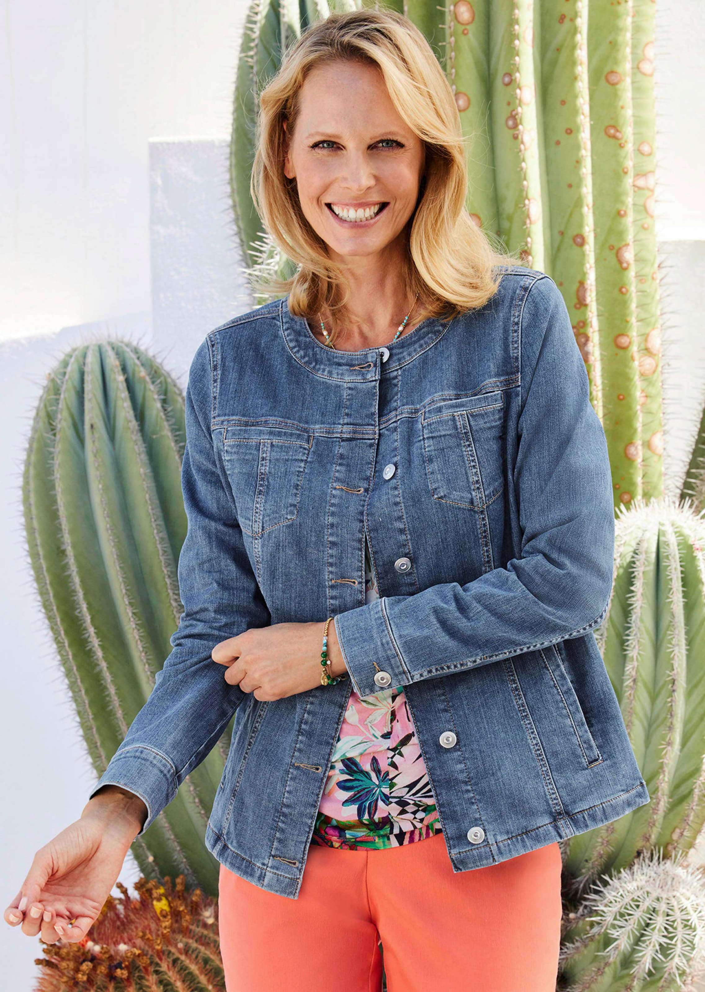 Jeansjacke mit topmodischer Waschung. Lässig gearbeitet mit femininem Rundhalsausschnitt, klassischer Nahtführung und Leistentaschen. Die Ärmelmanschetten mit Knopf und Schlitz lassen sich umschlagen. Mit streckenden Längsteilungsnähten sowie Passe im Rückteil für perfekten Sitz. Weiche Baumwolle mit Elasthan für besten Komfort. Länge ca. 62 cm in Gr. 46, ca. 58 cm in Gr. 23.