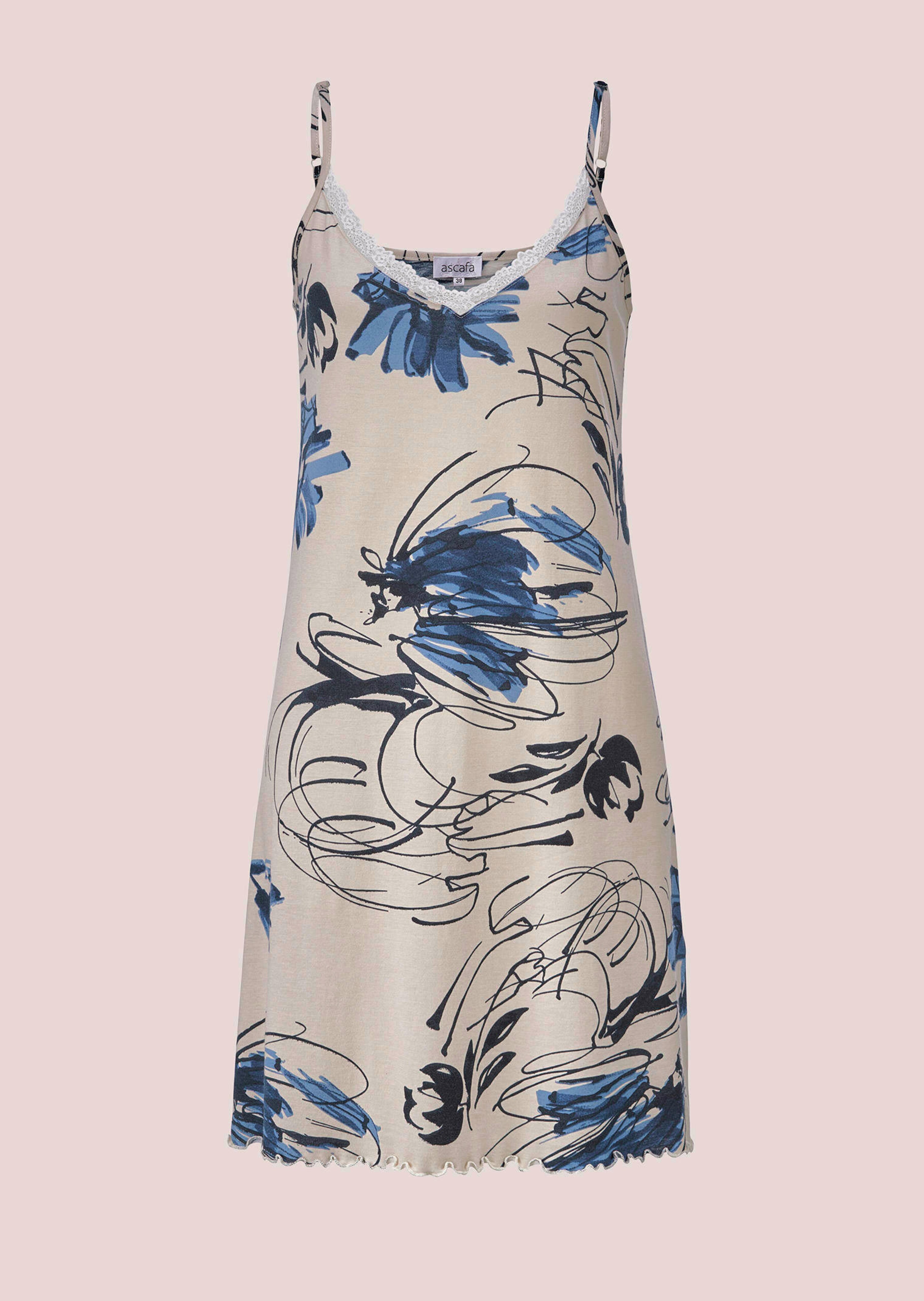 Nachthemd von ASCAFA – ein Hauch von Sommer in abstraktem Blütendruck. Der V-Ausschnitt wird von einer feinen Spitzenkante umrahmt, während längenverstellbare Spaghettiträger für individuelle Passform sorgen. Der weiche Baumwoll-Modal-Jersey schmiegt sich sanft an und endet in einem charmanten Wellensaum. Ein femininer Begleiter für erholsame Nächte.