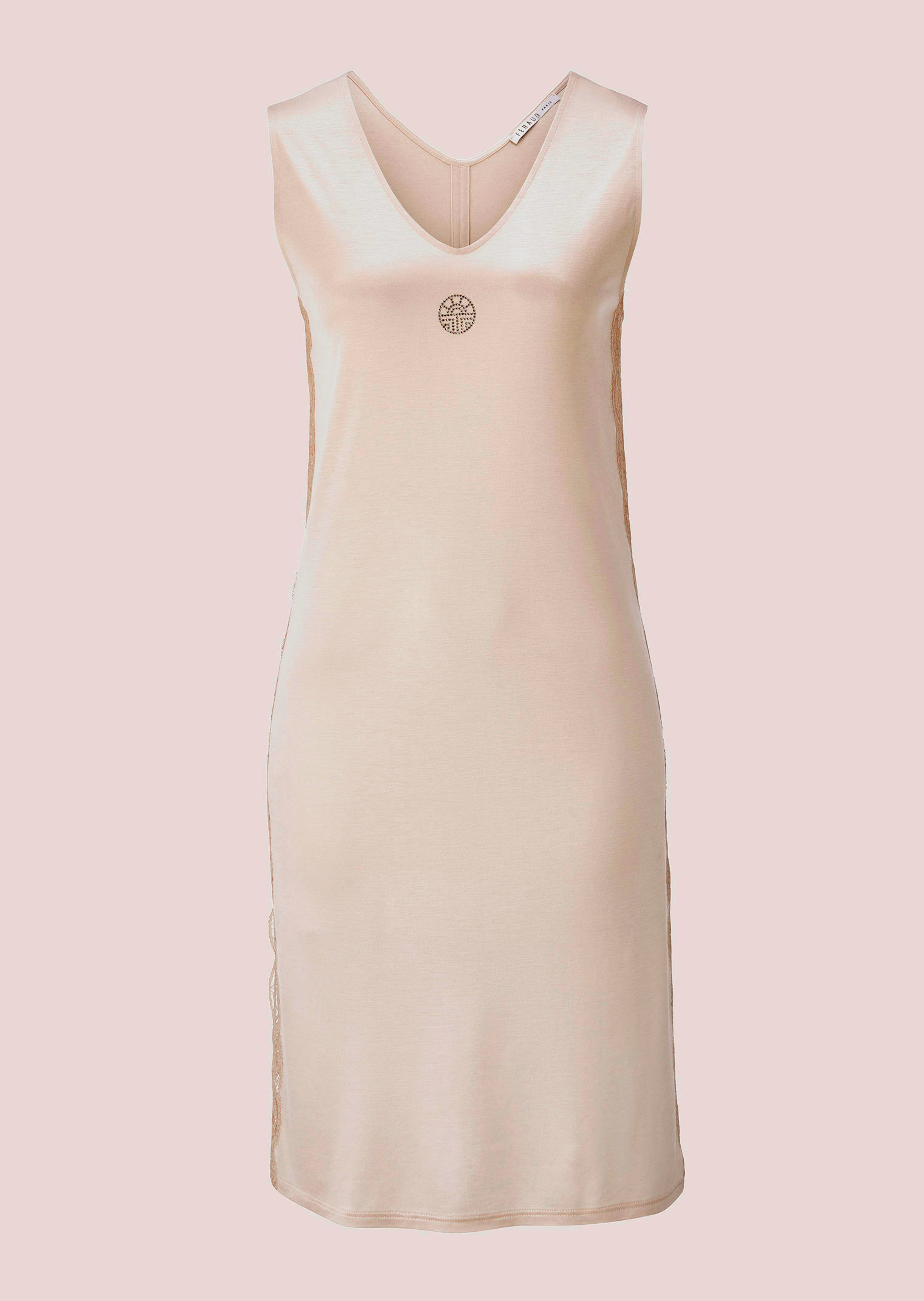 Seidig-weiche Eleganz für besondere Momente bringt dieses Negligé von FERAUD. Die hochwertige Micromodal-Seide-Mix schmiegt sich angenehm an die Haut und glänzt dezent. Breite Spitzen an den Seitennähten und ein zartes Glitzerstein-Motiv am Vorderteil setzen elegante Akzente. Der V-Ausschnitt und die rückwärtige Teilungsnaht strecken die Silhouette, zwei Seitenschlitze sorgen für Bewegungsfreiheit.