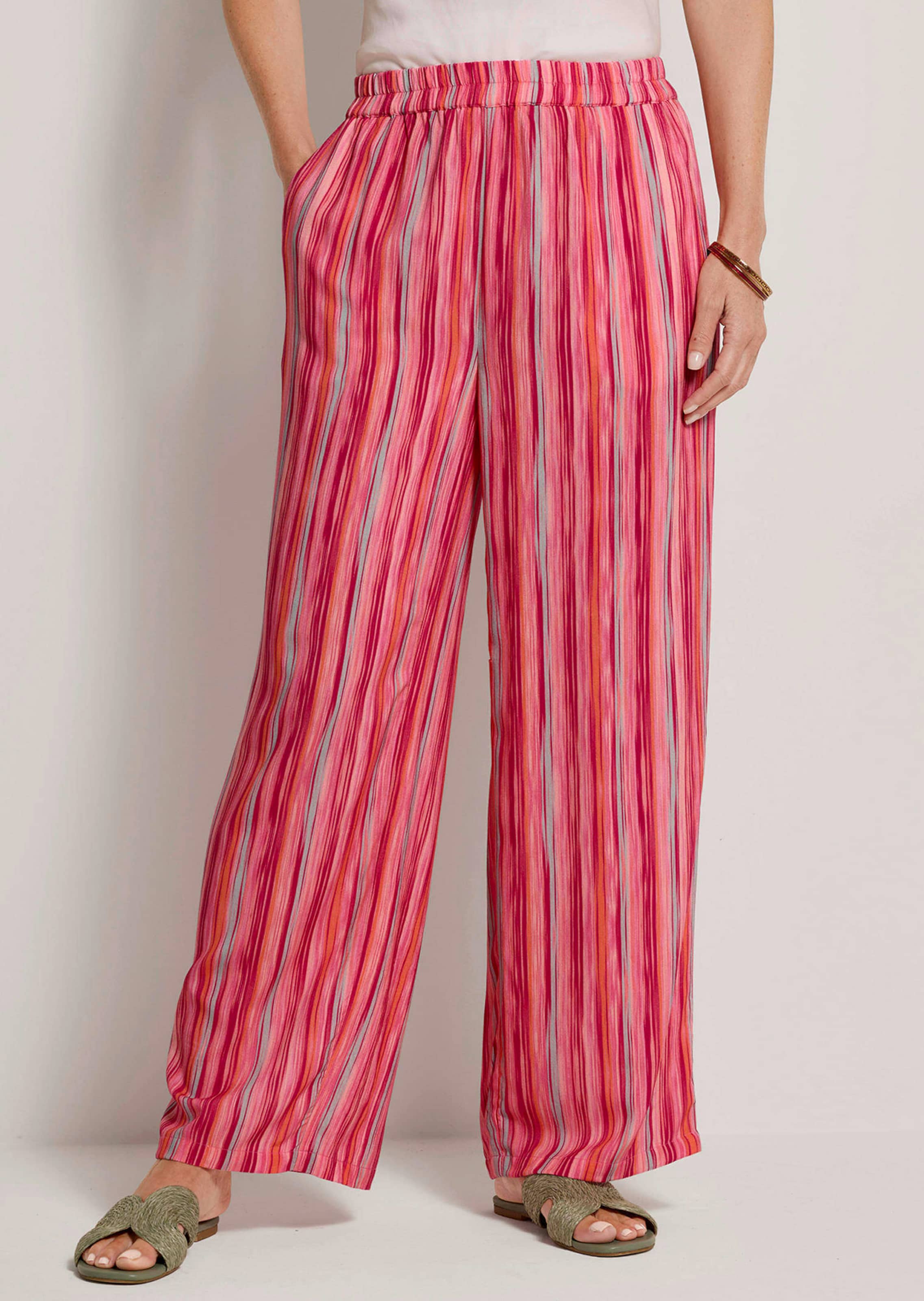 Hose VERA mit bequemem Rundumschlupfbund und seitlichen Eingriffstaschen. Die fließende Viskosequalität lässt das weite Bein schön schwingen. Ein echtes Wohlfühlmodell, dass die Figur dank farbharmonischer Längsstreifen optisch streckt. Saumweite ca. 58 cm. Weiter Beinverlauf.