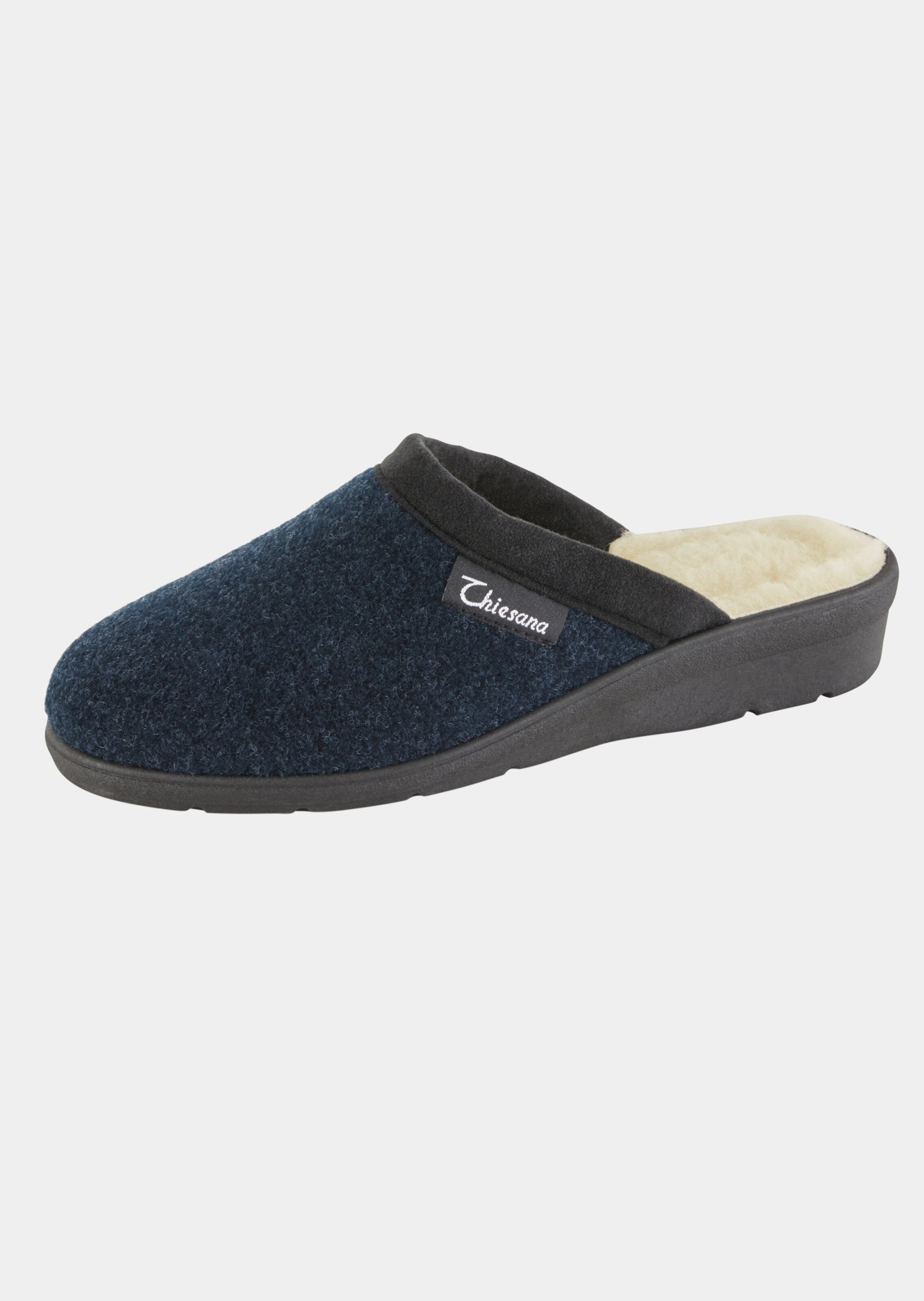 Pantoffel in G-Weite aus textilem Obermaterial. Die Innenausstattung aus reiner Schurwolle sorgt für wohlige Wärme, ideal für kalte Tage. Die schlichte Form und die kontrastfarbige Einfassung verleihen dem Schuh ein zeitloses Design. Daran werden Sie lange Freude haben!