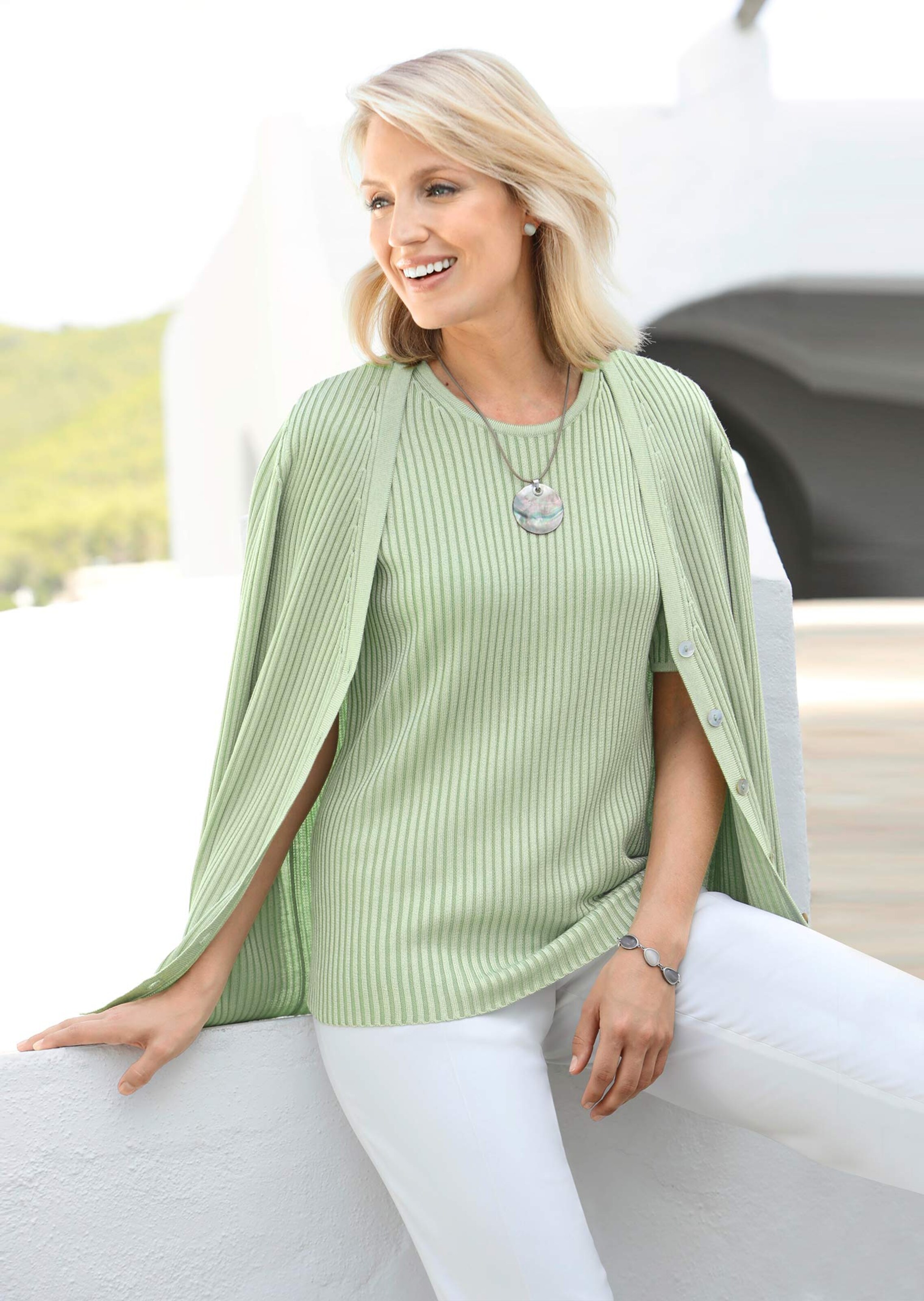 Strickjacke mit hochwertiger Rippenstruktur aus plattierten Garnen – zaubert einen wunderschönen Glanzeffekt. Die pflegeleichte Qualität trägt sich selbst bei höheren Temperaturen angenehm leicht. Aufwändig in Form gestrickt für beste Passform. Die Knöpfe in Perlmutt-Optik unterstreichen den edlen Charakter des femininen Modells. Mit tiefem V-Ausschnitt und langen Ärmeln – die Abschlüsse sind glatt gestrickt. Länge ca. 70 cm in Gr. 46, ca. 66 cm in Gr. 23.