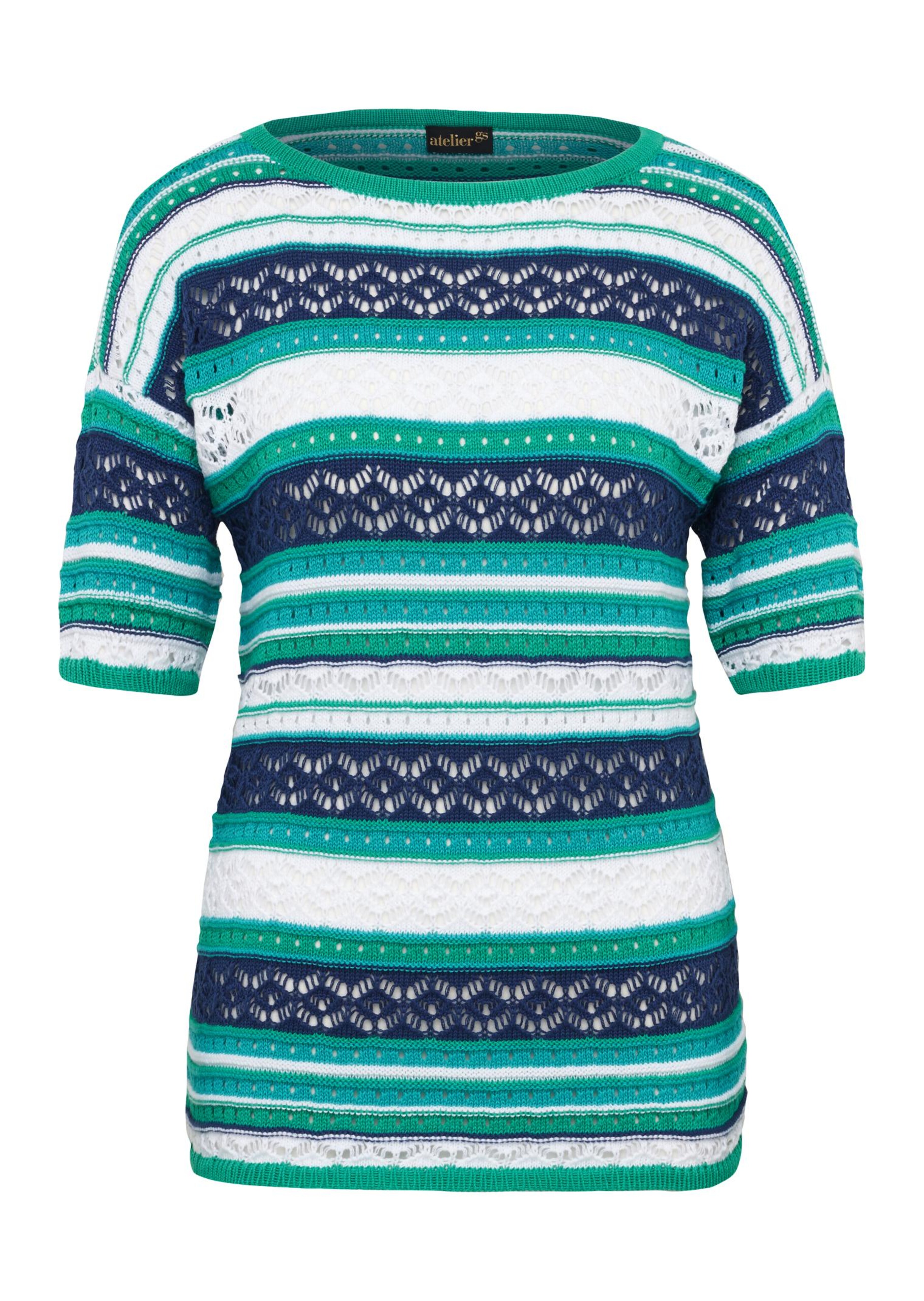 Pullover als idealer T-Shirt-Ersatz: Ihr kombistarker Partner verwöhnt dank reiner Baumwolle mit leichten, luftigen Trageeigenschaften. Die vielfältigen Ajourstrickarten kreieren eine spannende Ringeloptik. Modisch interpretiert mit U-Boot-Ausschnitt mit Tubularabschluss und überschnittenen Schultern. Schmal gerippte Säume. Länge ca. 67 cm in Gr. 46, ca. 63 cm in Gr. 23.