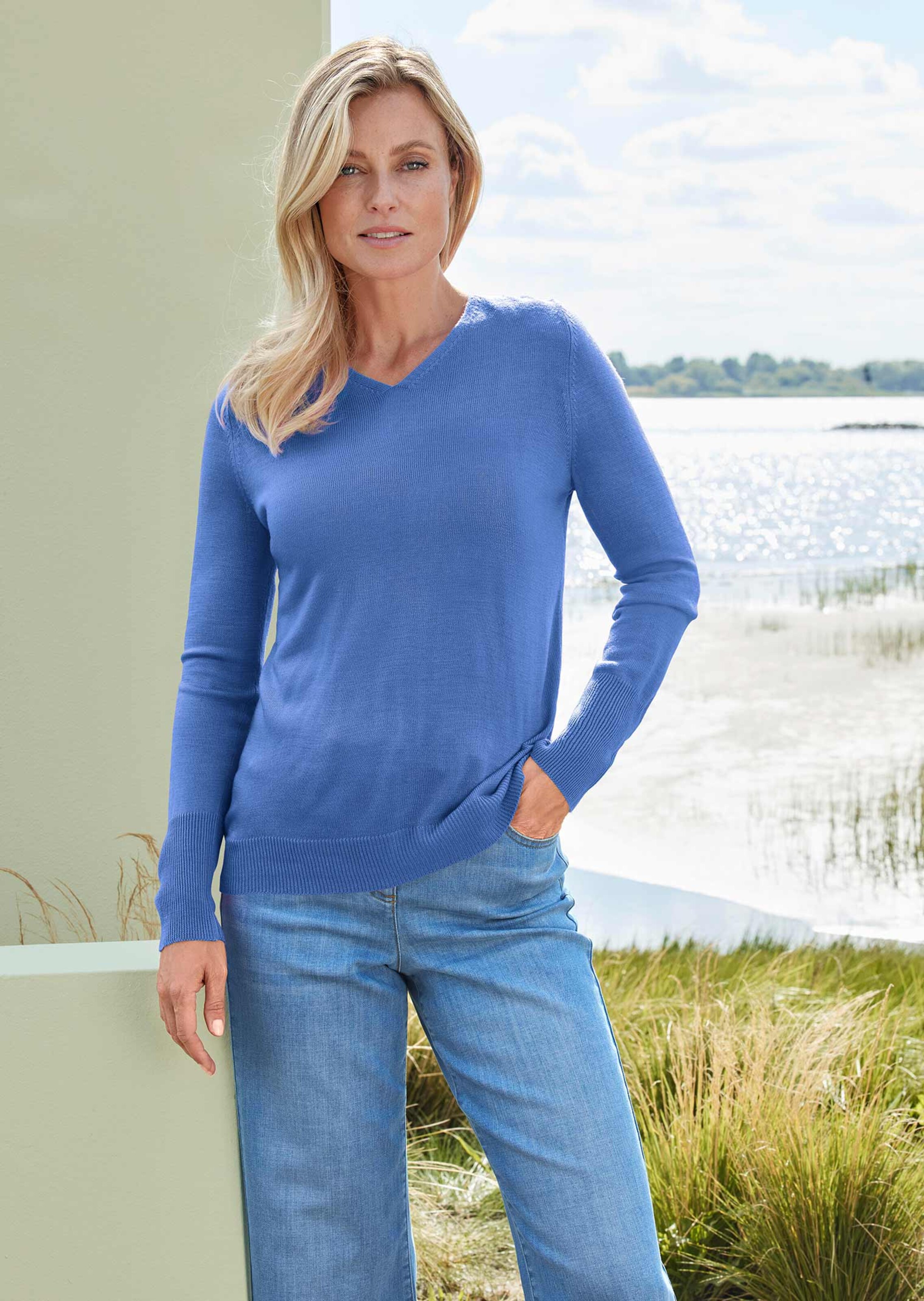 Pullover mit V-Ausschnitt. Die hochbrillante Farbgebung macht aus dem bezaubernden Kombipartner einen echten Blickfang. Wer weiss, vielleicht wird er Ihr neuer Favorit für diese Saison. Das schöne Modell ist mit langen Ärmeln gearbeitet, die in modisch breiten Rippenabschlüssen enden. Die hochwertige Materialzusammenstellung trägt sich angenehm und ist wunderbar pflegeleicht – sie trocknet schnell und ist nahezu knitterfrei. Länge ca. 67 cm in Gr. 46, ca. 63 cm in Gr. 23.