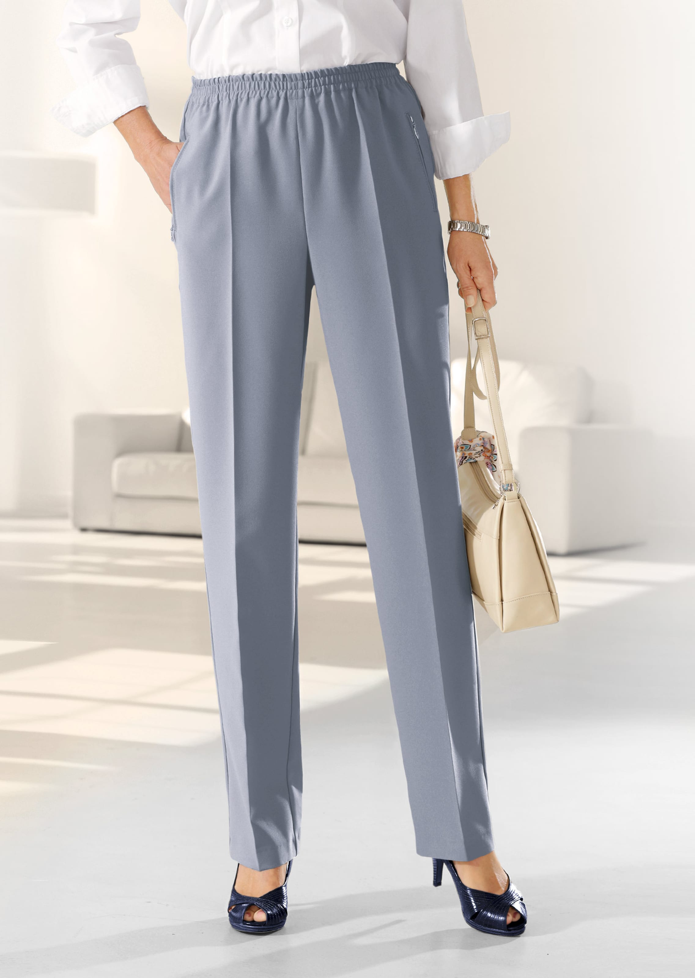 Reiseschlupfhose CARLA mit Rundumschlupfbund eignet sich perfekt für jede Reise oder langes Sitzen und ist daher unverzichtbar in Ihrem Kleiderschrank. Dank Schlupfbund engt nichts ein oder kneift am Bauch – das koffertaugliche Material bleibt nahezu knitterfrei und ist herrlich pflegeleicht. Mit eleganter Bügelfalte für eine rundum gepflegte Optik. Saumweite ca. 44 cm. Gerader Beinverlauf.
