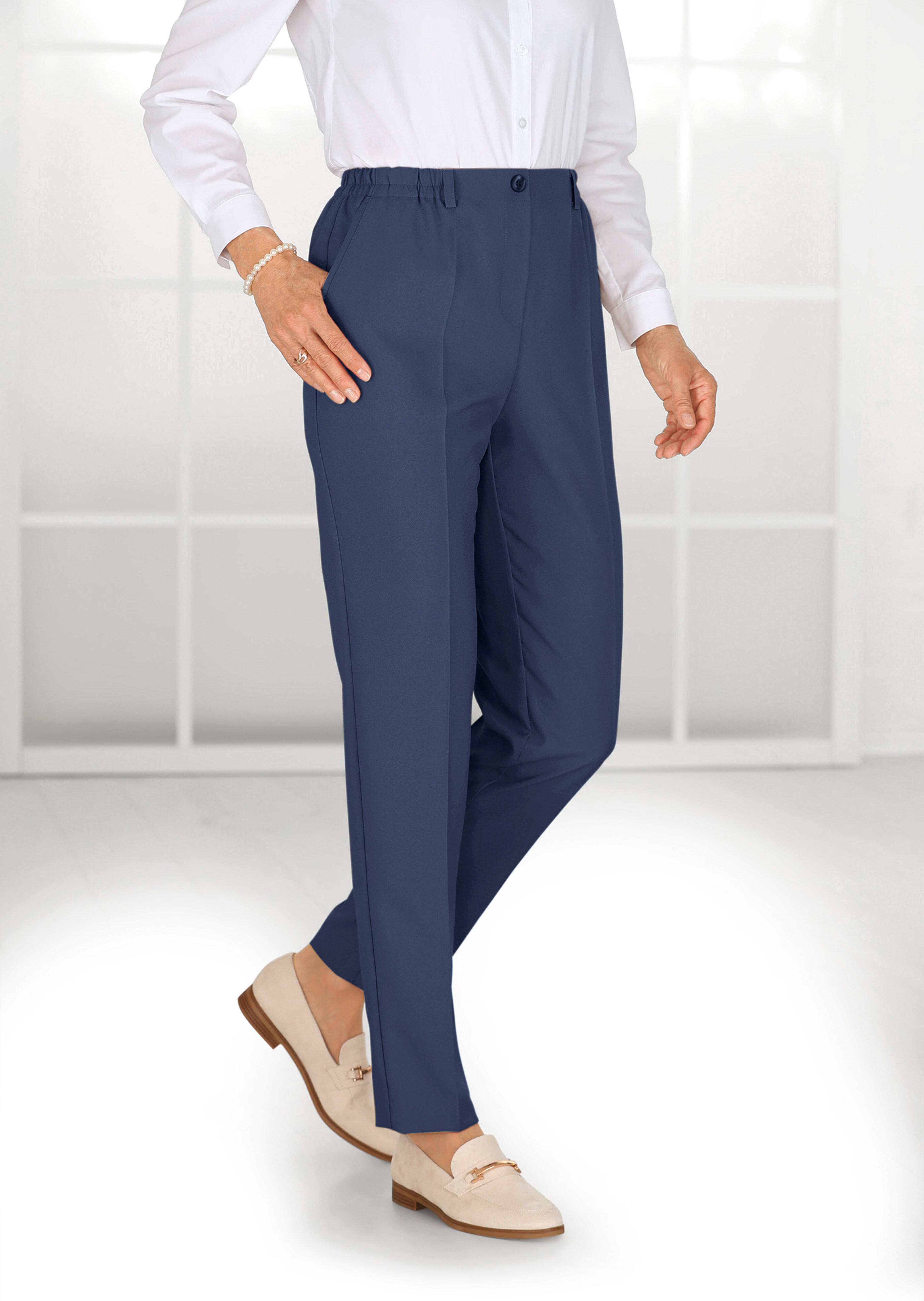 Schlupfhose die mit einer modernen Fleckschutz-Technologie ausgestattet ist. Die schmutz- und wasserabweisenden Eigenschaften machen das bequeme Modell zu einem überaus beliebten Begleiter. Die vordere Bundpartie ist glatt gehalten – so trägt nichts auf. Seitliche Eingrifftaschen mit Paspel, Gürtelschlaufen sowie die streckenden Bügelfalten runden die gepflegte Optik perfekt ab. Saumweite ca. 36 cm. Schmale Beinweite.
