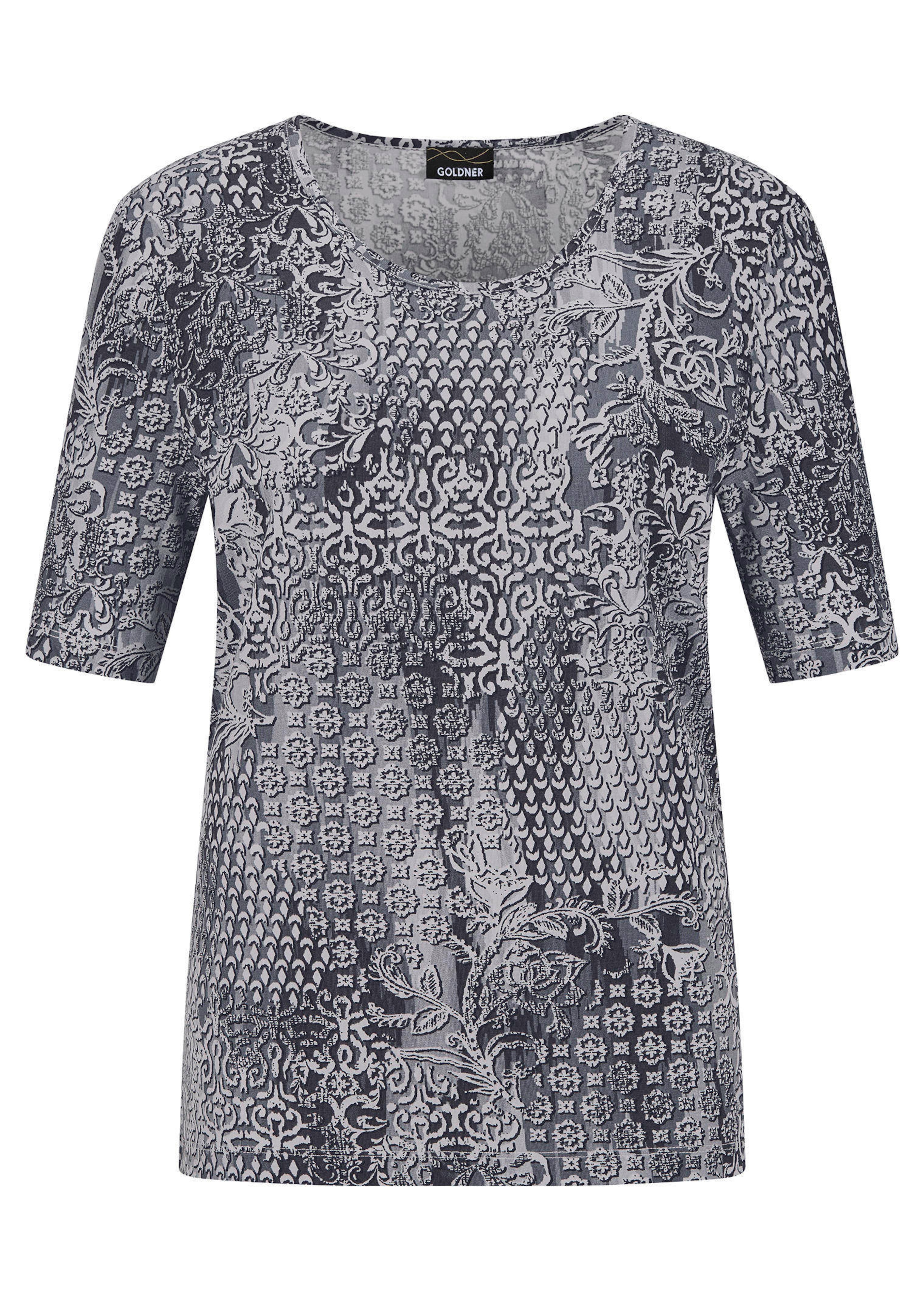 Shirt in fliessender Viskosequalität mit stretchbequemem Elasthan. Das Ornamentmuster bekommt durch den Farbverlauf einen raffinierten Twist. In figurschmeichelnder Passform mit Rundhalsausschnitt und Halbarm. Länge ca. 64 cm in Gr. 46, ca. 60 cm in Gr. 23.