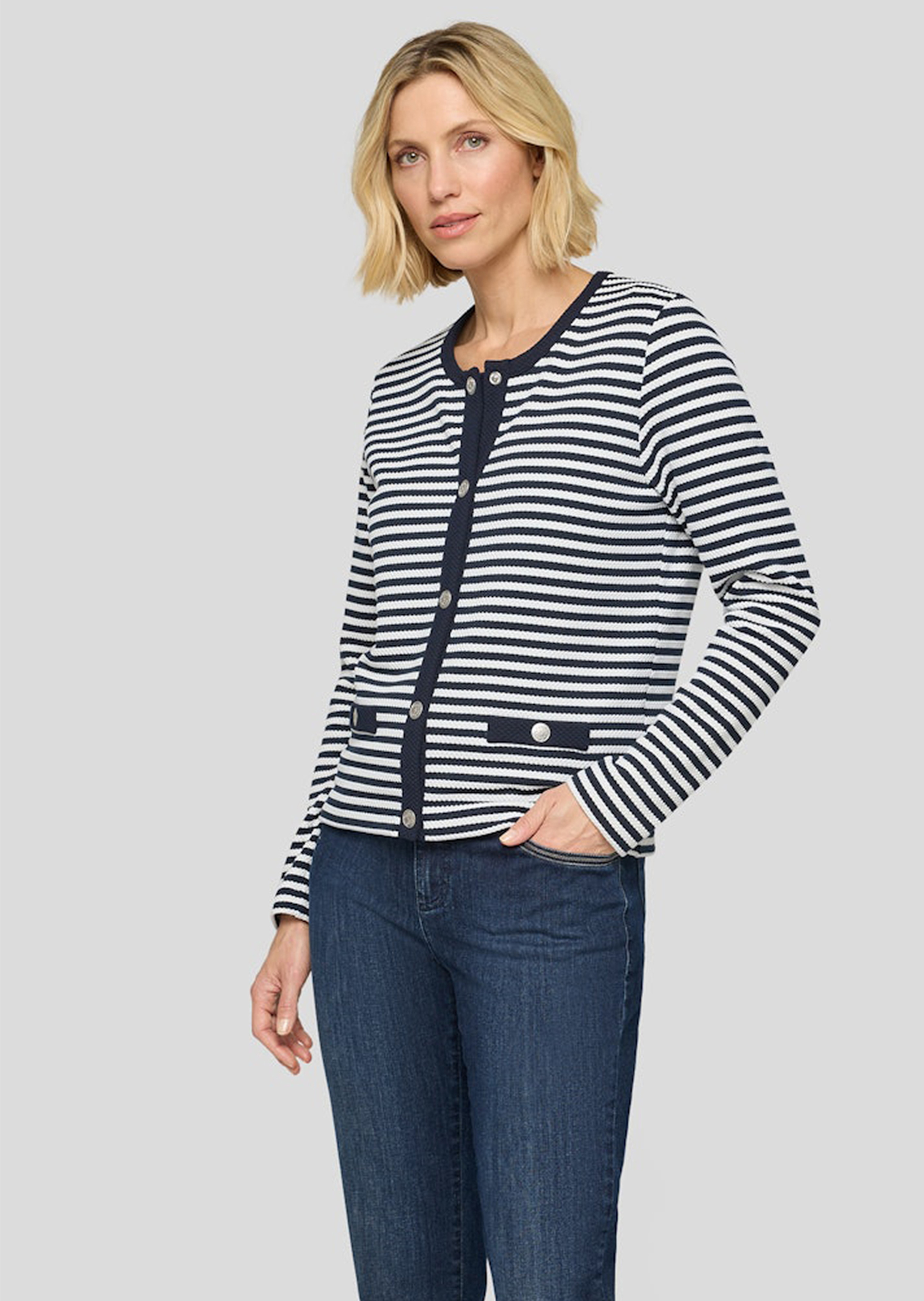 Shirtjacke von RABE in klassischer Cardiganform, die durch ihre besondere Oberfläche sofort ins Auge fällt. Die elastische Struktur-Jersey-Qualität mit leichtem 3D-Effekt ist formstabil und bewegungsfreundlich. Eine durchgehende Druckknopfleiste ermöglicht bequemes An- und Ausziehen, angedeutete Taschen setzen dezente Akzente im Vorderteil. Rundhalsausschnitt und Knopfleiste sind mit einer Kontrastblende eingefasst und unterstreichen den zeitlosen Charakter. Länge ca. 64 cm in Gr. 46.