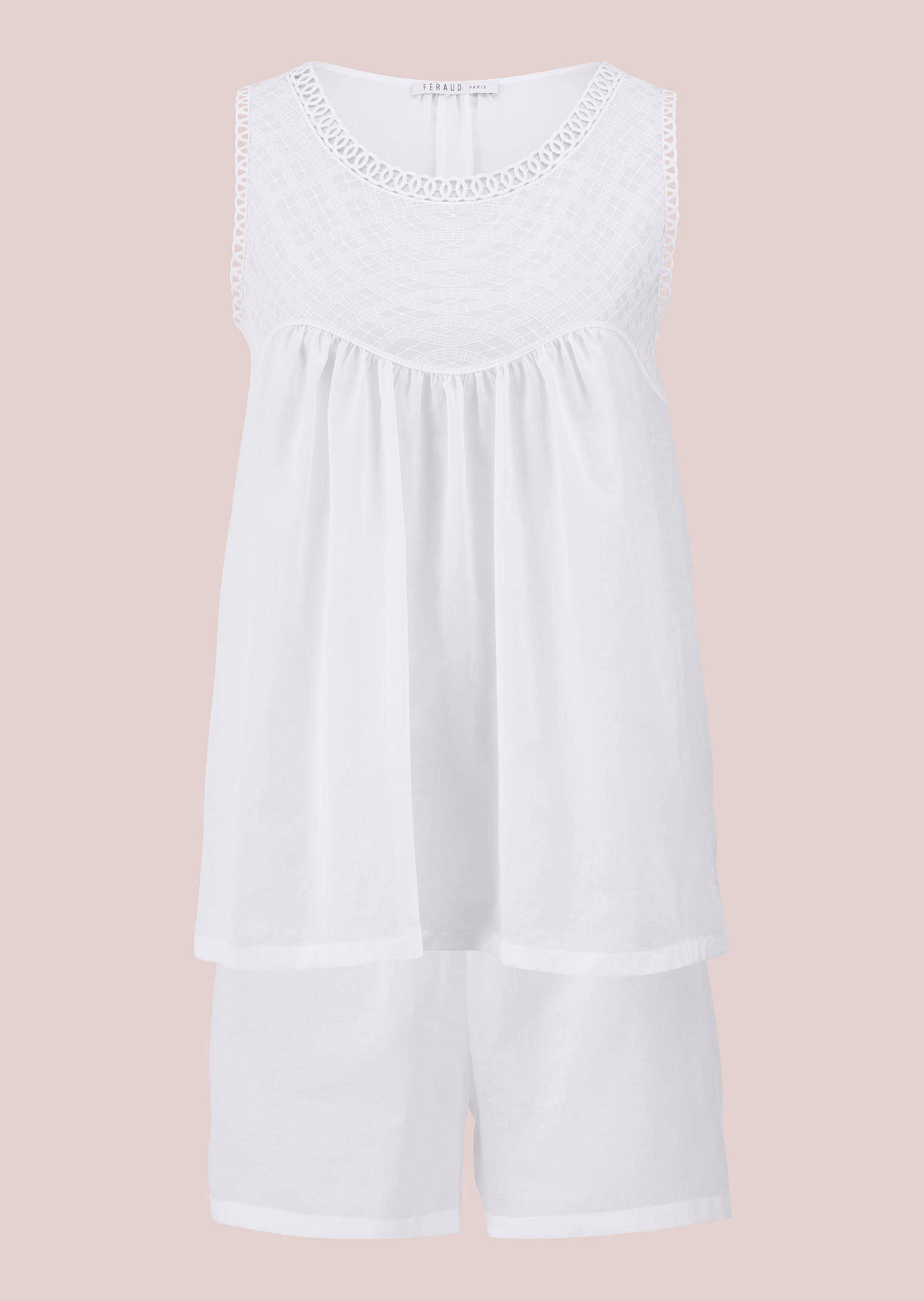 Zart, komfortabel und mit liebevollen Details: Das Shorty-Set von FERAUD kombiniert reine Baumwolle mit einem dekorativen Spitzeneinsatz. Das ärmellose Babydoll-Oberteil schwingt luftig über dem Bund, der Rundum-Dehnbund der kurzen Hose sorgt für bequemen Sitz. Seitliche Schlitze geben extra Bewegungsfreiheit und runden den femininen Look stilvoll ab. Ein Must-have für alle, die feine Nachtmode schätzen.