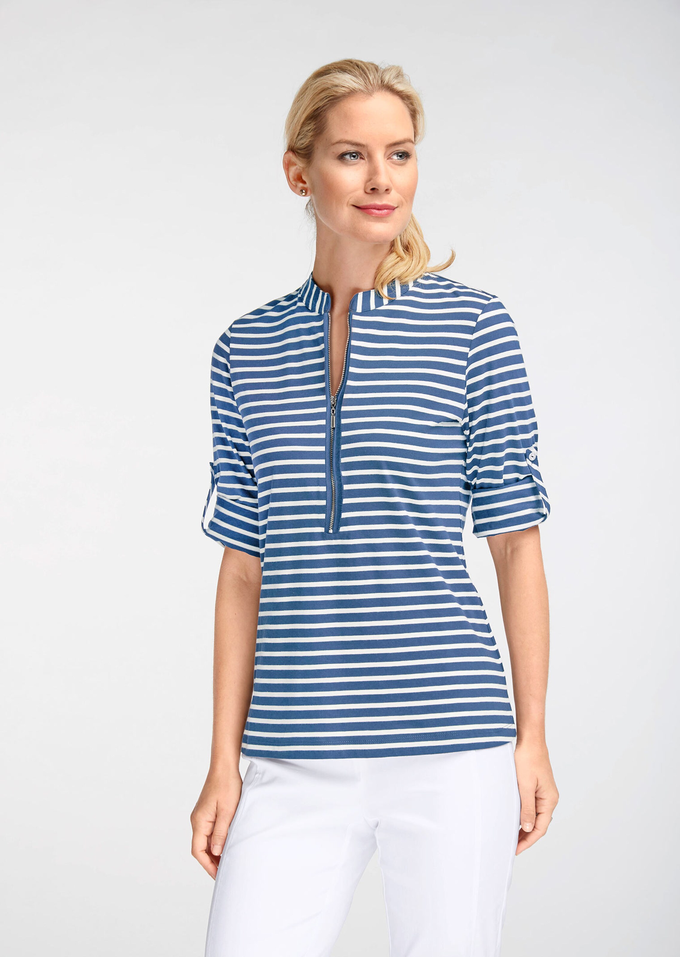 Ringelshirt in legerer, kaschierender Langform. Die Ringel sind garngefärbt und in typischer, aufwändiger GOLDNER-Manier gearbeitet: An der Seitennaht verläuft das Muster so absolut exakt, dass Ringel auf Ringel passen. Kleiner Stehkragen mit Reissverschluss am Ausschnitt. 3/4-lange Ärmel mit Knopf und Riegel zum Krempeln, je nach Belieben. Die reine, hautfreundliche Baumwolle schenkt höchsten Tragekomfort. Länge ca. 67 cm in Gr. 46, ca. 63 cm in Gr. 23.