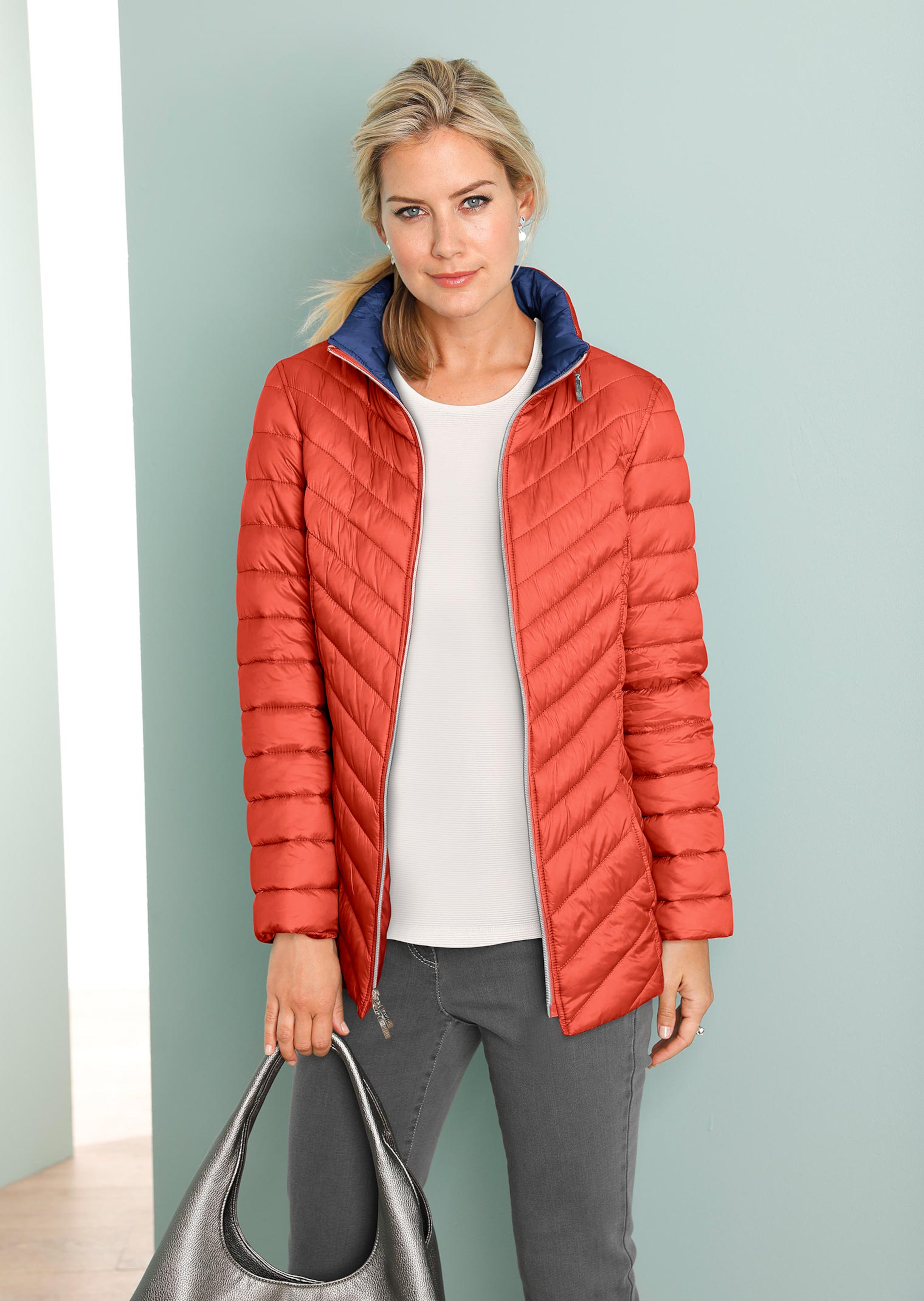 Steppjacke mit modischem Diagonalstepp: Schmeichelt der Figur, ohne dabei aufzutragen. Ultraleicht und knitterunempfindlich wie echte Daune. Mit edlem Zwei-Wege-Reissverschluss, Wiener Naht, leicht wattierten Ärmeln und Eingrifftaschen. Kapuze im Kragen verstaubar. Länge ca. 71 cm in Gr. 46, ca. 67 cm in Gr. 23.